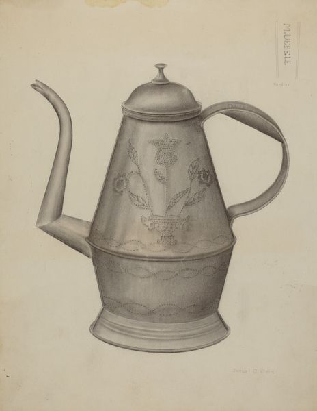 Editor: We're looking at "Pa. German Teapot" painted by Eugene Shellady in 1937, rendered with tempera and drawing. It's a still life of, well, a teapot. The first thing I notice is how carefully the artist depicts the floral details etched onto the surface. What strikes you about this work? Curator: What strikes me is how an object so ordinary is elevated. Teapots, especially in Pennsylvania German folk art, were often associated with hospitality and domestic harmony. Notice how the vertical floral design directs the eye upward, almost like a family tree, suggesting connection to ancestors and lineage. Do you see that intentionality? Editor: I see the upward movement, and the family tree idea makes sense! But is it really that deep for something we use every day? Curator: Everyday objects held great symbolic weight. Consider the heart motifs in Pennsylvania German art - often symbols of love, faith, and commitment, interwoven into daily life. Now, observe the handle. Its shape almost echoes a stylized tulip, which was a common motif representing beauty and faith in this cultural context. Editor: I didn't notice that resemblance! So the teapot is like a convergence of different, positive symbols, connected to values. Curator: Precisely! It invites contemplation on heritage, values and the art that finds beauty and meaning in everyday life. A cultural touchstone in a vessel. Editor: That's incredible. I thought it was just a teapot! Now I see all of these layers, embedded into the details. It changes everything. Curator: Indeed. Images hold stories, waiting to be unfolded. The mundane becomes monumental through cultural memory and artistry.