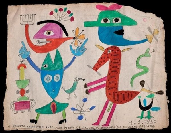 Curator: Here we have Victor Brauner’s "Eclaircissement," a mixed-media work from 1950, showcasing a playful arrangement of figures and symbols. Editor: Oh, this is charmingly odd. My first impression is of a theatrical troupe on some distant planet. The colours are so gentle, like a faded circus poster. Curator: Brauner, as a key figure in Surrealism, often explored themes of identity, mythology, and the subconscious. His artistic practice frequently intersected with occultism, something reflected in this work's enigmatic symbols. Editor: Definitely feeling the subconscious vibe. Those creatures—are they animals? Humans? Amalgams of both? That orange, striped figure especially looks like it wandered out of a fever dream! Curator: He lived through turbulent times in Europe, which led to a period of experimentation, including an increased use of mixed media, seen clearly here. It reflects an era shaped by rapid political change, but one in which the idea of psychoanalysis gripped society. Editor: Mixed media suits the dreamlike quality so well. It’s like the boundaries between reality and imagination are intentionally blurred, mimicking how dreams themselves often feel like collages of fragmented memories. And pastel colors create soft mood; I find it calming but with unsettling details like that menacing-looking snake on the right side! Curator: It certainly poses interesting questions about the self, its connection with the external world, and perhaps an acknowledgement of inherent fragmentation. We can see Brauner grappling with these larger existential ideas throughout his body of work. Editor: The composition is intriguing. It's both balanced and unsettling, with these creatures holding various implements and expressions... and somehow it all resonates with a deeper truth. Curator: Thank you for sharing your perspective. Hopefully our conversation today can provide just that—"Eclaircissement," or enlightenment—as we try to unlock the multiple layers of meaning Brauner offers us in his work. Editor: A lovely piece indeed! It’s left me thinking about the beautiful messiness of dreams, and the magic hidden within the unusual.
