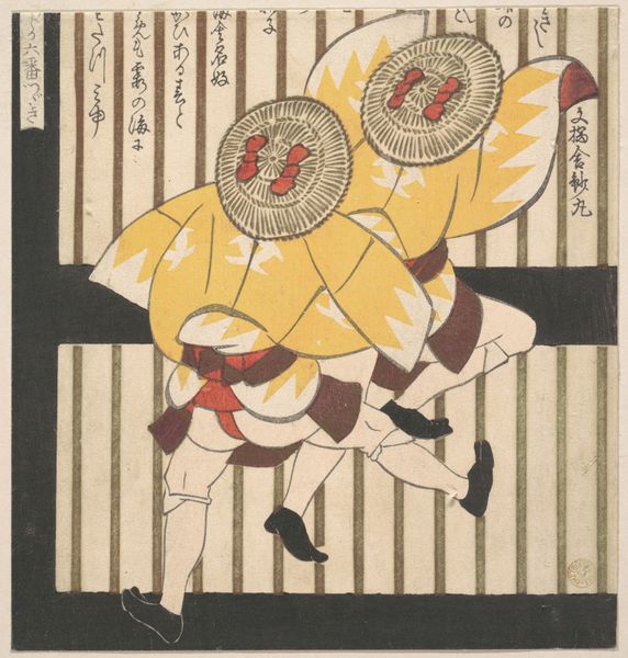 Editor: This is "Sparrow Dancers, from A Set of Six for the Katsushika Circle" by Yashima Gakutei, dating back to around 1827 or 1828. It's a watercolor print, and it feels so energetic! These figures seem caught in mid-step. What narratives do you think are at play here? Curator: Well, consider the context: late Edo period Japan, a time of rigid social structures. Ukiyo-e prints like this often served as a form of subversive expression. The "dancers" are likely commoners, perhaps even performers, masked by those distinctive hats. How might these masks and stylized movements relate to ideas of identity and social roles at the time? Editor: So, are you suggesting the dance itself could be a commentary? A hidden critique maybe? Curator: Precisely. Think about who these prints were made for—the burgeoning merchant class, eager for representations of their own lives, perhaps with a wink and a nudge. These “sparrow dancers” may represent freedom found in art. The energetic movement contrasted to the stiff social conventions of the time. What do you think the arrangement and presentation of the dancers does? Editor: That's fascinating. I guess the panelled composition then reflects a society also divided by class and convention. Each dance is within their own sectioned space. Curator: And those writings—they provide context, right? Perhaps even clues, or ironic counterpoints to the visual narrative. It's important to also notice what's omitted, what's unspoken. How do you think an art piece could challenge norms or inspire conversations? Editor: I'm beginning to see this print not just as a depiction of dancers, but as a multi-layered statement about identity, class, and social freedom through performance. Thank you, this changed how I view the artwork. Curator: Art is a reflection of life, the lives we choose to reveal and those we are asked to keep secret. Analyzing how artists visualize the constraints, as well as freedoms, is where we gain valuable cultural understanding.
