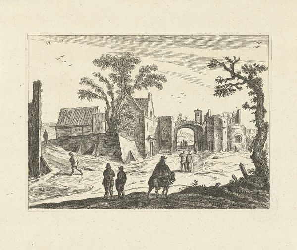 Editor: Here we have Johannes Gronsveld’s "Landschap met dorp aan rivier," which roughly translates to "Landscape with village on a river," created sometime between 1679 and 1728. It's an engraving, so a print. The composition has a wonderfully casual, almost snapshot-like quality to it. How do you interpret the artist’s choices in this work? Curator: Its intrinsic structure is carefully constructed. Notice the stark contrast of textures—the rough thatching against the smooth water surface. How do these contrasts operate within the overall design? Editor: I see what you mean. There's a definite emphasis on texture and shape; the linear precision used to describe the natural world contrasts strongly with the broad shapes used for the buildings. The overall impression feels quite balanced. Do you think the texture holds any meaning here? Curator: Yes, precisely. Texture, when approached through formalism, has profound meaning. Consider the rough thatch, an organic form depicted through dense, ordered lines. Do you observe a similar treatment in the rendering of the human figures and architecture? Editor: Absolutely. There's a sort of ordered chaos, a way that lines interact and overlap, to describe surfaces as both busy and structured, but somehow calm. Curator: Exactly. Further observe the interplay between light and shadow achieved through varying densities of lines, the organization of this engraving into distinct areas. What philosophical implications does this structure suggest? Editor: Well, maybe this tension between order and chaos in the lines reflects how humans impose organization on nature or maybe how we build structures. Curator: A cogent observation. Formal analysis brings into view an array of potential meanings locked in the artwork. Do you feel this method is limited in any aspect? Editor: Perhaps. Sometimes it feels that this way, context might be missed out, and we need other methods too, to bring everything together. Curator: A judicious perspective. Remember, critical views always add layers to an artwork, revealing complexity that might otherwise remain concealed.
