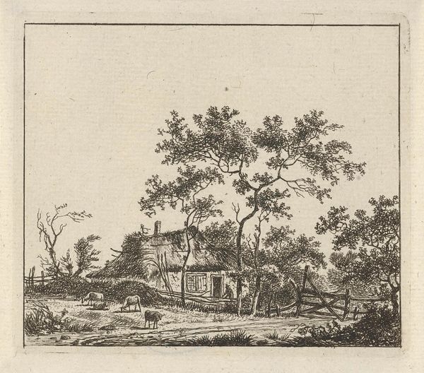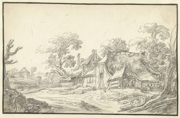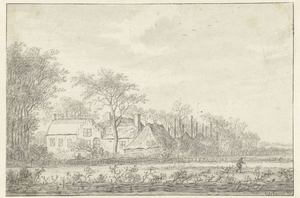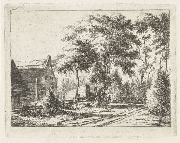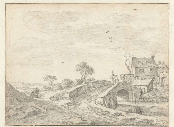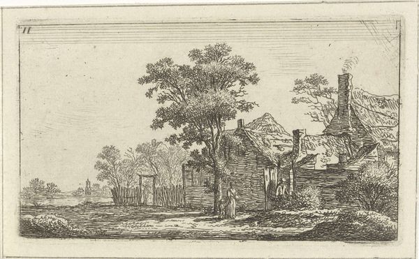 Editor: This is "Farm on a Canal near Haarlem" by Esaias van de Velde, created around 1615 or 1616. It's a drawing done in ink and etching and I find its intricacy amazing for such a small piece. It looks so peaceful. What draws your eye in this work? Curator: Initially, one observes the formal arrangement of the etching. Note the deliberate interplay between the verticality of the trees and the horizontality of the canal. This juxtaposition establishes a visual rhythm, subtly dividing the composition into distinct spatial zones, wouldn't you agree? Editor: Yes, I see how the trees create a sort of screen against the open space above the water. What is the effect of using those contrasting horizontal and vertical lines? Curator: It leads us to question the intended structural symbolism. Van de Velde’s deployment of line weight is similarly calculated; notice how darker, more emphatic strokes define the immediate foreground, while lighter, finer lines delineate the background elements, thus generating a sense of recession. Observe the mirroring reflections on the water. It creates balance but is slightly distorted. Editor: Ah, the subtle depth is really effective. Curator: Precisely. These formal strategies suggest that the essence of the work lies not simply in its depiction of the mundane—a simple farm—but in its rigorous articulation of pictorial space. Do you agree? Editor: Yes, focusing on how the landscape is composed really opens up the visual narrative beyond just "a farm". Thanks for pointing that out. Curator: A rigorous focus on such pictorial elements can often unveil the most salient features of a work.