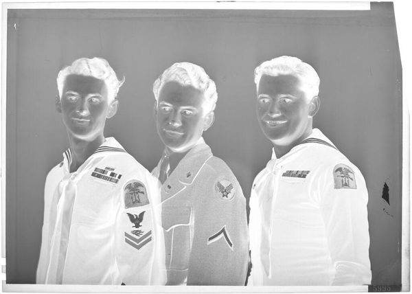 Editor: This is an untitled photograph by C. Bennette Moore, showing Eugenie Stoll in a scout uniform, presented as two side-by-side images. It's striking because it's a photographic negative. What social context informs this portrait? Curator: Considering the absence of a date, it's difficult to pinpoint the precise historical moment. However, the scout uniform points to ideals of citizenship and conformity. I wonder, what does the doubled image suggest about identity and representation, especially for young women in scouting at that time? Editor: Maybe it’s about seeing different sides of the same person? Curator: Perhaps. And what about the photographic negative itself? It challenges our notions of truth and objectivity in portraiture, doesn't it? Editor: I hadn't thought of it that way. Thanks for the insight! Curator: Of course!