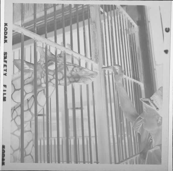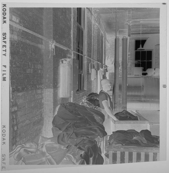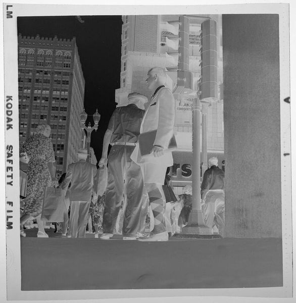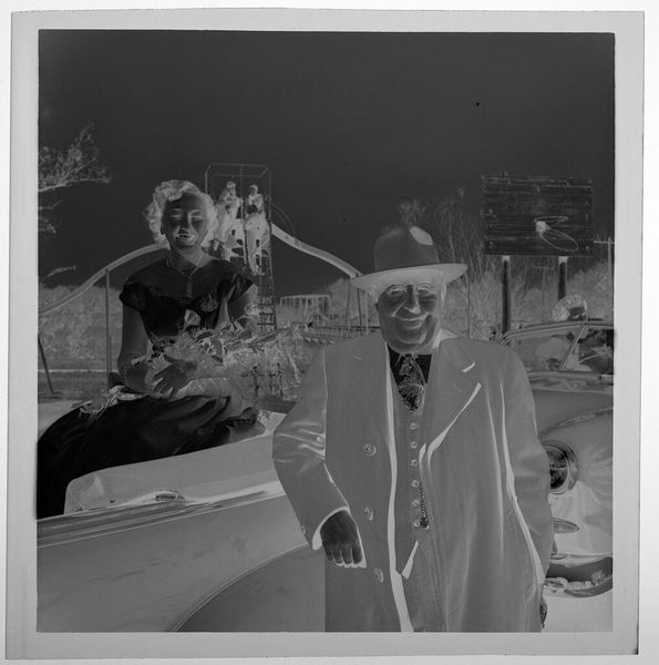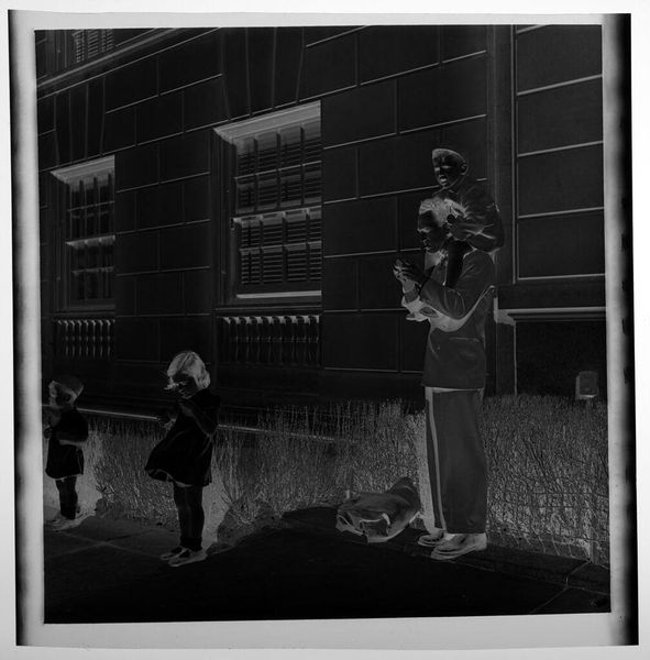 Curator: Here we have an untitled photograph by Jack Gould, currently held in the Harvard Art Museums, depicting two men observing a building. It’s a small image, roughly 5.7 x 5.7 cm. Editor: The high contrast and somewhat ghostly figures create an immediate sense of unease. There’s a real tension between the subjects and the imposing architecture. Curator: Indeed, the hats worn by the figures suggest a sense of collective identity, yet their averted gazes hint at a kind of dissociation from the scene, or perhaps a somber reverence. The architecture appears to be damaged or under construction. Editor: Yes, the image's formal arrangement and inverted tonality definitely adds a psychological layer, almost like a collective trauma or a shared memory of a place. The men are literally facing the past. Curator: Perhaps the figures symbolize the everyday observer, quietly bearing witness to moments of transition and transformation. The image becomes a testament to resilience. Editor: Ultimately, Gould has crafted a resonant piece. The contrasting textures, combined with the subjects’ quiet observation, create a memorable experience. Curator: It gives us a lot to think about.