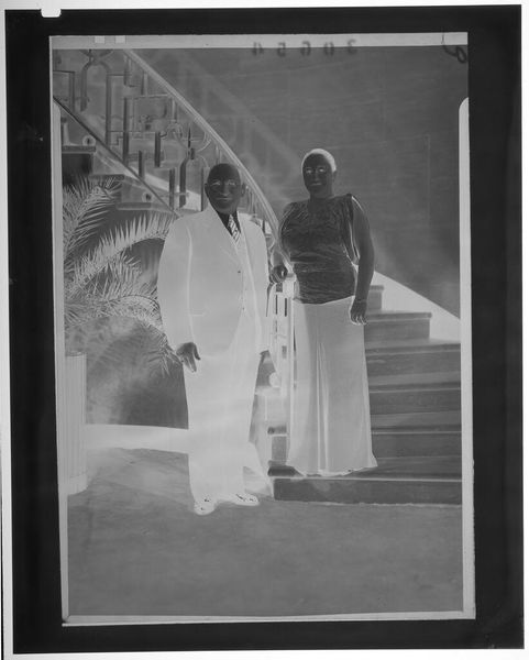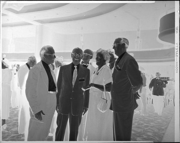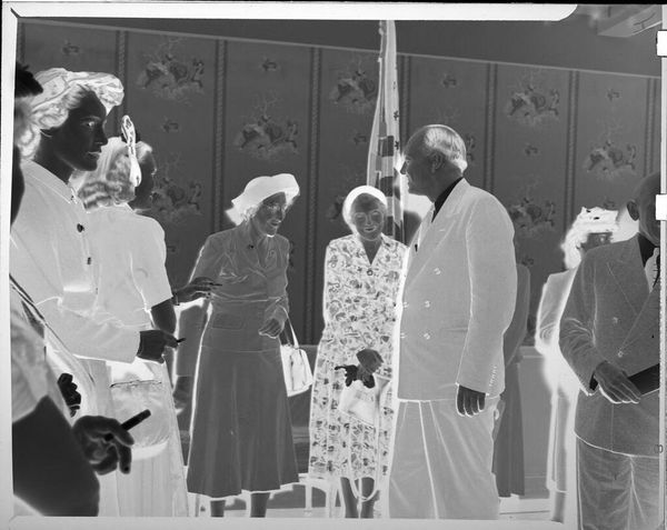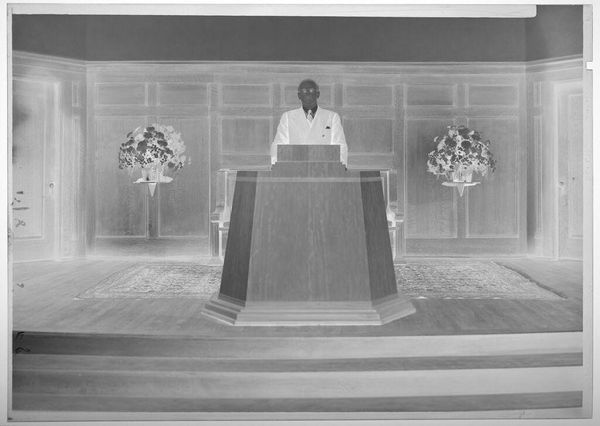 Editor: Here we have an Untitled silver gelatin print by Peter James Studio, showing two men shaking hands at a podium. The setting appears formal. What aspects of this photograph stand out to you? Curator: I'm drawn to the means of production. The gelatin silver print, itself a product of specific chemical and labor processes, captures a moment likely orchestrated for public consumption. Consider the podium, the American flag. Editor: So, the image is less about the handshake and more about its intended audience and how it was made? Curator: Precisely. The materiality of the photograph is as significant as the event it depicts, shaping its meaning and purpose. Editor: That gives me a new way to look at the photograph, considering the production and context together.