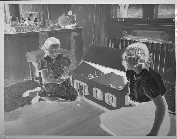 Editor: This photograph by Martin Schweig, titled "Untitled (young boy and baby girl playing with 7-Up bottles in living room)," captures what appears to be a candid moment. The contrast is striking. What do you see in this piece? Curator: I observe a deliberate arrangement of forms and tonal values. The play of light across the surfaces—the sofa's floral pattern, the children's clothing, and the 7-Up bottles—creates a visual rhythm. The composition, though seemingly casual, presents a careful balance between light and shadow. Do you agree? Editor: I do. It's like the bottles echo the lampstand. I initially thought it was just a snapshot, but the balance you mention makes it more intentional. Curator: Precisely. The photograph transcends mere documentation, inviting us to consider the formal relationships at play. A simple setting transformed through careful articulation of shape and light. Editor: Thank you, I see that now. It's been helpful to look beyond the subject matter.