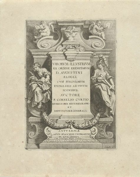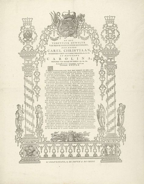 Editor: This is "Grafmonument van Anna Stonhouse," an engraving made around 1747 by Simon Fokke, currently residing in the Rijksmuseum. I'm immediately struck by how meticulously detailed it is, especially considering its purpose as a memorial. It’s overflowing with symbols and text. How do you interpret its imagery, particularly in relation to the time it was created? Curator: Well, it's crucial to understand the role prints like this played in 18th-century Dutch society. Beyond a personal memento, it functioned as a public declaration. Engravings like this, circulated widely, served to solidify the social standing and piety of the deceased, and by extension, their family. What do you make of the inclusion of the skull beneath the book? Editor: It definitely emphasizes mortality, reminding the viewer of life’s transience. And the flames feel very Baroque, a dramatic touch! Does the choice of Baroque indicate a particular religious leaning or cultural preference? Curator: The Baroque style, while waning in some artistic circles, was still associated with a certain grandeur and established authority. Its presence here speaks to a desire to present Anna Stonhouse and her family as part of that established order. Consider also the coats of arms: what do they tell us? Editor: They suggest a lineage, an attempt to place her within a historical narrative and confirm her family's status. It all seems very carefully constructed to control the image and memory of the deceased. Curator: Precisely! And it highlights how even seemingly personal objects were, in that era, heavily mediated by social expectations and aspirations. It’s a potent reminder that art is rarely divorced from its socio-political context. Editor: It's fascinating to think about this engraving as not just a memorial, but also a carefully constructed piece of social and political communication. I had not considered that. Curator: Yes, viewing art through the lens of history offers a richer, more nuanced understanding. I find that incredibly enriching!