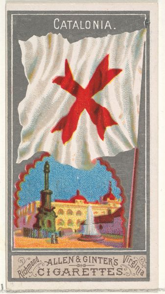 Editor: Here we have a curious piece, a print titled "Jerusalem, from the City Flags series (N6) for Allen & Ginter Cigarettes Brands," dating back to 1887. It’s quite small and almost has a fantastical storybook quality to it. I'm especially struck by the flag with its multiple crosses. What's your interpretation? Curator: Ah, yes! It *does* whisper tales, doesn't it? This little gem speaks volumes about how the late 19th century viewed the world – packaged neatly into collectible cigarette cards! That flag you noticed, representing Jerusalem, looms large over an idealized depiction of the city. But observe, it's an imagined Jerusalem, seen through the lens of Orientalism and academic art. What catches your eye about that combination of styles? Editor: Well, the precision and detail of the buildings seem very academic, almost like an architectural drawing. But then the romantic, soft lighting and the exotic figures give it that Orientalist flair. Curator: Precisely! It’s this fascinating tension that makes it sing. Allen & Ginter weren't just selling cigarettes; they were selling dreams of distant lands, history lessons simplified, exoticism commodified. They're telling us a grand story, yet reducing it to the scale of a consumer product. It is more advertisement than accurate cultural documentation. The drawing is designed to evoke curiosity. Does it make you curious? Editor: Definitely. It makes me want to learn more about how Jerusalem was perceived at the time and question the accuracy of the representation. Curator: Indeed! It's a portal to understanding not just Jerusalem, but the complex way the West viewed the “Orient," wrapped up in consumerism. What a thought, lighting up a cigarette and contemplating Jerusalem. Editor: It’s amazing how a seemingly simple cigarette card can open up such a multi-layered conversation about history, culture, and commerce.