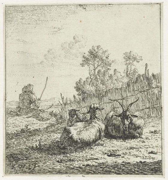 Curator: Look at this charming drawing, "Two Sheep and a Goat" by Barend Graat, made before 1652. Editor: It's interesting. A rural idyll perhaps? The texture in the sheep's wool almost vibrates—the effect is kind of stunning given the simplicity of the materials. Curator: I find myself wondering about the position of these animals, their social context, or the status they embody within the landscape. Considering seventeenth-century Dutch art, are we looking at the representation of wealth? Editor: Well, given that Graat was also a painter and these seem more like working drawings done with a pen—quick studies— it’s likely the livestock are subjects the artist used for developing a different kind of formal project. What about labor practices relating to sheep raising? Curator: Precisely, that relationship is key, because we’re never looking at the animals divorced from their material and social place within a Dutch, and patriarchal, society. Land ownership, textiles, the class structure…it's all right there, isn’t it? The question then is not simply ‘is this aesthetically pleasing,’ but ‘how is power and labor embedded in its representation?' Editor: Absolutely! These pastoral images often whitewash the intense labor surrounding animals, farming, textiles, not to mention the ecological context, but here you can really see the materiality of wool almost take on a presence of its own through the scratching of the pen, like the land itself coming through the animal. Curator: Exactly! And thinking about Graat's social position helps ground this observation: he was a contemporary to Rembrandt and may have seen himself as something of a counterpart when considering the human/animal relationship. Editor: Looking at how the cross-hatching defines the curves and contours, I find it difficult to avoid the conclusion that he wants to feel how these creatures move through the fields; a visceral and artistic interpretation. Curator: It also suggests that Graat likely viewed this landscape as an idealized projection, and not something that directly mirrors society. Editor: Ultimately, the making and the material speaks of work as much as the end products. Curator: Indeed. A piece like this reminds us to challenge our own preconceived notions around identity, especially those constructed for us, by a dominant society. Editor: Precisely, a work like this makes one look at a deeper cultural history within materiality, process and the lives lived by others.