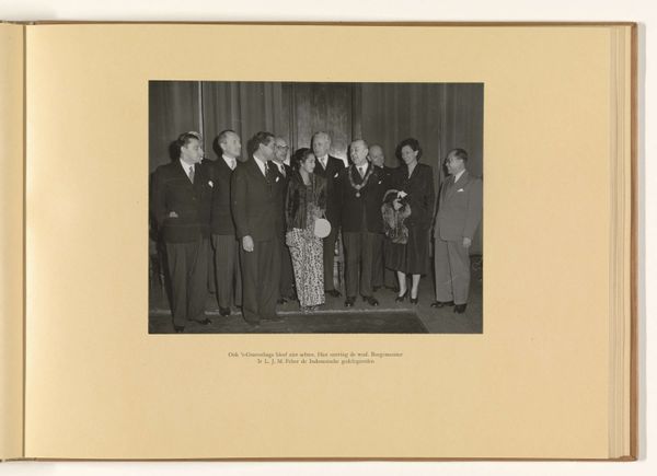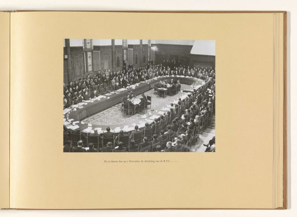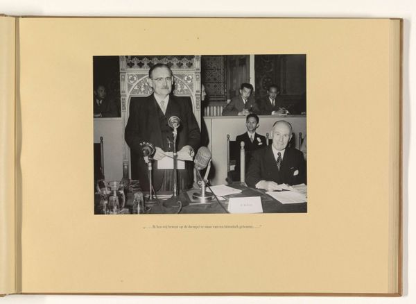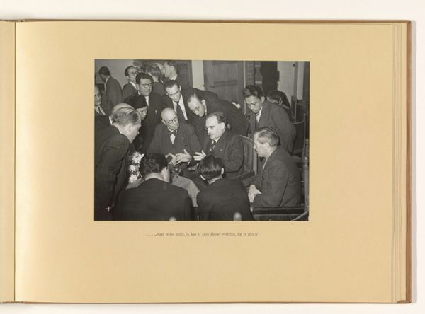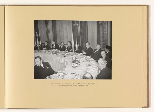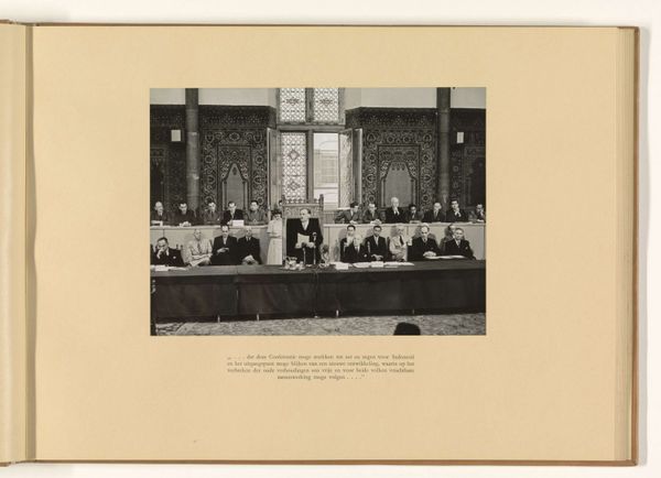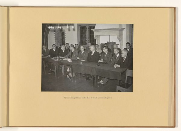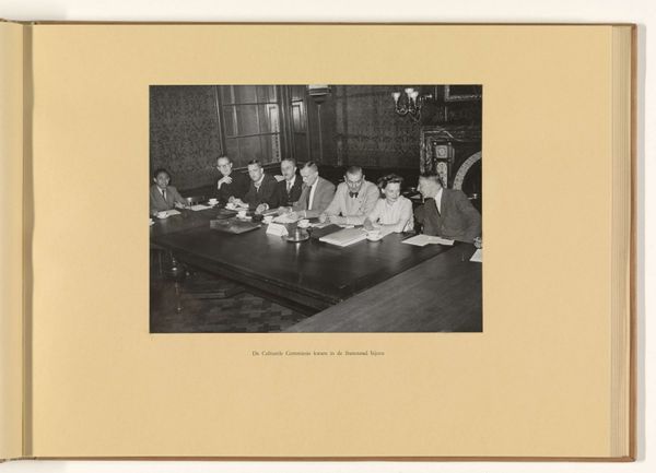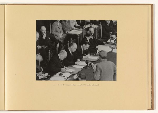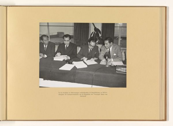 Editor: This gelatin-silver print, titled ".... die stuk voor stuk door de voorzitters van de Nederlandse en Indonesische delegaties ....", is possibly from 1949, attributed to Regeringsvoorlichtingsdienst. It's a stark image, almost like a historical record frozen in time. What exactly do you see going on here? Curator: I see the culmination of specific material processes: the labor involved in producing the photographic print itself, from the mining of silver for the emulsion to the development chemicals and printing process. These aren't just neutral materials, are they? The production of these resources and the dissemination of the final image also reveal power dynamics embedded in the image’s creation and distribution related to the Dutch colonial enterprise. Editor: So you're saying the very materials themselves are politically charged? How so? Curator: Precisely. Silver, for instance, often comes from mines operating within exploitative labor systems. Furthermore, consider the technology involved – the cameras, the darkroom equipment. Access to and control over these tools signify technological dominance and colonial administration at that time. It forces us to question who had the means to document and disseminate this specific narrative. Editor: I never thought about it that way. I was so focused on the faces, the people, and the historical event itself. Curator: The image invites us to explore beyond just the subjects represented to interrogate the networks of production and circulation within which this photograph exists. Who consumes this image, and what implications do these actants elicit to a wider audience? Editor: This has opened up a totally different perspective on interpreting images for me. Considering the socio-economic circumstances of its creation is fascinating! Curator: Indeed. By understanding these aspects, the art serves as evidence to reveal larger dynamics happening within power relations, technological advances, and political negotiations that have helped to inform the past.