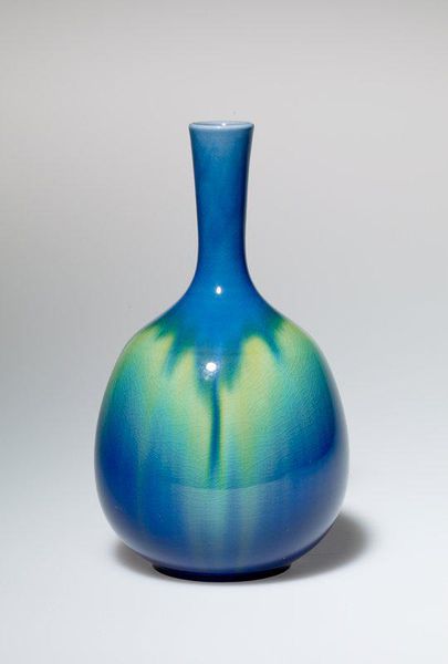 Editor: Here we have Henri Rapin's "Rapin No. 8," created in 1926. It's a ceramic piece, and I'm immediately struck by how the contrasting lines and patterns create a sense of depth and movement. What do you make of it? Curator: The interplay between the pale blue and white striations against the occasional spiraled forms creates an intricate, almost hypnotic visual experience. Observe how the linearity, a key aspect of the Art Deco movement, manifests here not just as straight lines but as curvilinear segments mirroring each other, establishing rhythm through repetition and alteration. Editor: The spirals disrupt the lines. Is there significance in their placement and the stark colour difference? Curator: The placement appears deliberate. The darker tone accentuates these focal points, drawing our eye through the composition. Without the stark tonality shift and their curvilinear contrast against the rigid background linearity, the artwork would forfeit dynamism, perhaps bordering on the monotonous. What feeling do the varied, repeated striations elicit from you? Editor: It is busy but orderly; quite pleasing, I'd say. I see what you mean by rhythmic! It’s interesting how focusing on these visual relationships almost detaches the object from its function as a vase. Curator: Precisely. By bracketing the external allusions, we reveal the object's visual complexity; how a repetitive linearity, can evolve into a complete, balanced aesthetic form. Editor: I hadn't considered looking at it *only* as line, form, and color, isolated from its historical or utilitarian context. Thanks for widening my view! Curator: Indeed! And viewing through your eyes reaffirms how art can provoke dialogue regarding basic intrinsic compositional choices that can shape our aesthetic perception.