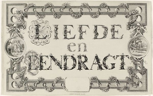 This calligraphic print, made by Leonard Jozef Ferrier in 1787, advocates for unity in the Netherlands through an ornate design combining text and symbolic imagery. The central inscription proclaims "Love to the Fatherland begets Unity," reflecting the political climate of the Dutch Republic at the time. The print’s visual language underscores its message. The decorative frame, adorned with garlands and classical motifs, evokes a sense of tradition and stability. Medallions depicting allegorical figures of civic virtue flank the text, reinforcing the call for patriotism. Made during a period of internal political strife between the Patriots and Orangists, this print, and others like it, served a public role, aiming to influence public sentiment and promote social cohesion. To fully understand its impact, historians delve into archives, newspapers, and pamphlets of the period, reconstructing the social and political context in which this work was created and consumed. Art like this, therefore, acts as a window into the past, revealing the complex interplay between art, politics, and society.