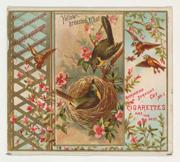 Curator: Here we have a delightful print, "Chickadee," from the "Birds of America" series, created in 1888 for Allen & Ginter Cigarettes. It's currently held here at the Metropolitan Museum of Art. Editor: Oh, how charming! It has this naive quality to it, with the bird perched among impossibly large roses and berries. It almost feels like looking through a child's eyes. Curator: These cards were essentially miniature artworks, produced using drawings and watercolours. Their primary function, of course, was marketing – alluring Victorian smokers with a promise of refinement and taste. Allen & Ginter were located in Richmond, Virginia, which you can see labeled. The cards themselves were collected and traded. It challenges our assumptions about art and commodification. Editor: I find the presentation fascinating—such delicate beauty paired with something so decidedly... un-delicate as cigarettes. It’s that collision of nature and industry that truly piques my interest. Makes one think about the inherent contradictions of the time and of today. Curator: The material conditions were everything. It reflects both an increased industrialization of printing processes alongside an intense desire for nostalgic representations of the natural world being lost due to this same expansion. Editor: Absolutely. Plus, someone hand-painted these details and probably felt some form of connection or detachment doing this commercial project. The slight imperfections become deeply resonant somehow! It makes me want to search for these in my grandmother's attic. Curator: Precisely. Thinking about who manufactured these, in what context, how they were distributed and ultimately consumed tells a deeper story about labor practices. Editor: It really gives one something to consider. Curator: It does indeed! It speaks volumes when looking past only at surface aesthetics. The entire infrastructure supporting the artwork's existence, in a way, becomes its true masterpiece.