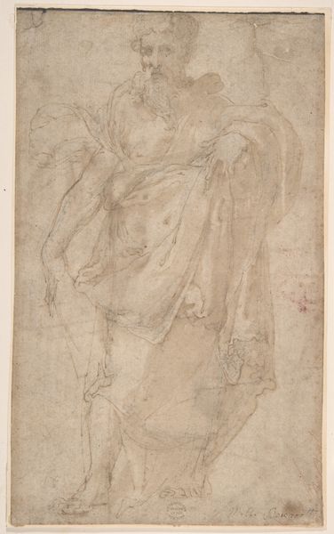 Curator: The work before us is entitled "Heiliger Sebastian am Baume," an arresting drawing rendered in pencil. Editor: Arresting is right. There’s an immediate sense of pathos, of resigned suffering in that slumped figure. The sketchy quality only amplifies the vulnerability, somehow. Curator: Alois Johann Penz is credited with creating this figural drawing; let's delve a bit into its possible cultural contexts. This artwork resides here at the Städel Museum, a German institution displaying and celebrating artworks within Germany, reflecting how national culture embraces imagery of universal ideas such as martyrdom. Editor: And Saint Sebastian, specifically, is so charged, isn't he? Beyond the literal suffering of a martyr, Sebastian embodies resilience. He survives the arrows! His iconography represents strength found in vulnerability, doesn't it? Consider that open chest, which visually connects the viewer to the subject. He has such a raw emotional affect. Curator: Precisely! His story becomes a potent visual for those who suffer injustice. The museum becomes not merely a container but also a stage upon which collective trauma is addressed. Further, consider that depictions of Sebastian often occur during plague outbreaks. Editor: It’s that layering that gets me—Sebastian representing the resilience of the human spirit against seemingly insurmountable odds, and in Germany he often figures as a cultural image that ties religious, national, and emotional imagery together. You mentioned injustices – the placement and care shown to such artworks reveals broader attitudes of our relationship with victims or people we judge unfairly. Curator: Indeed, museums play an active part in either furthering harmful social tendencies or in righting injustices via displaying and taking seriously art that humanizes those historically rejected by societies. Editor: The endurance of certain images reveals the endurance of cultural memory and continuing concerns, it seems. This depiction speaks poignantly about enduring, no matter how the world changes. Curator: A deeply relevant reflection for understanding the impact of a centuries-old drawing to new audiences and contemporary problems.