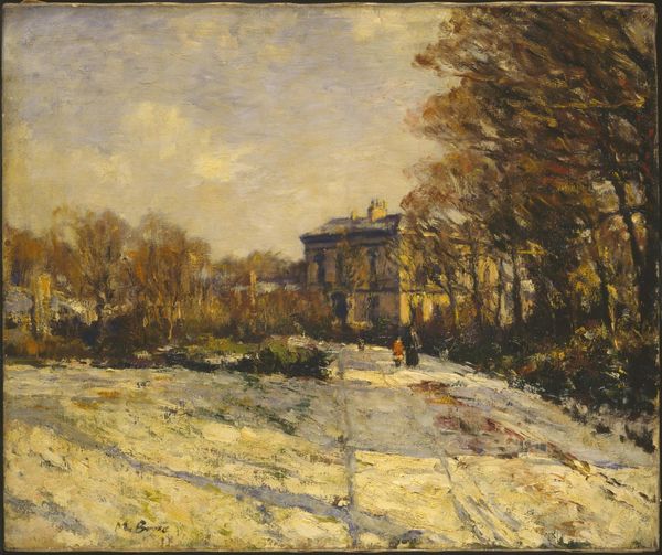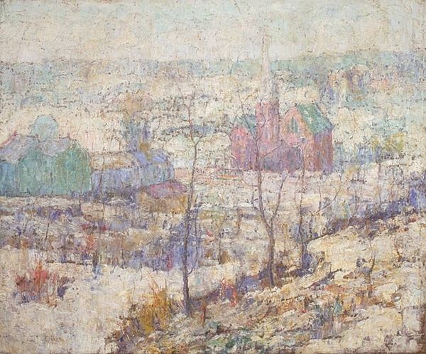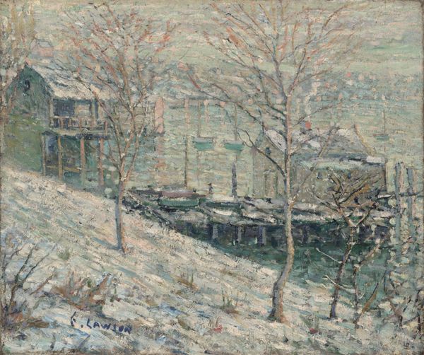 Curator: Ernest Lawson’s “Windy Day, Bronx River,” residing here at The Phillips Collection, offers a striking vista. The date is unspecified, leaving us to contemplate its moment in time. What's your initial take on this piece? Editor: Brisk. The wind practically whips off the canvas. The palette is limited, almost monochromatic, but that layering of blues and whites gives such a palpable sense of the cold and the movement in the air. Curator: Lawson, associated with the art collective "The Eight" and later "The Ten", often depicted everyday scenes with an Impressionistic bent, emphasizing the working class. Consider this in light of the early 20th-century American art scene— how does that frame your interpretation? Editor: Well, you've got the raw materiality right there. The visible brushstrokes, thick impasto suggesting not just the scene, but the physical act of applying paint, the labour that constitutes making. Look at how he captures the rough textures of the buildings! And is that… snow piled everywhere, dirty and packed down? Curator: Absolutely. He's known for capturing these very aspects. There is an unvarnished realism contrasting the romanticized landscapes of earlier painters, suggesting the grimier aspects of modern urban life, albeit with a delicate, almost romantic filter. Editor: And it's precisely that contrast I find interesting. The delicate touch in depicting what must have been a fairly grimy reality speaks to a conscious artistic choice. He elevates this very place, transforms industrial squalor to visual poetry through sheer paint. I want to see that thick application of paint! What kind of brushes and knives would he have been using? Curator: His methods of plein-air painting would have also influenced this outcome, setting him against other more formal and studio-based landscape practices of that period. His capturing the immediate atmosphere of a location shows us his artistic skill! Editor: It challenges traditional hierarchy that has long placed landscapes like this beneath still life, for instance, by representing urban scenes from working class people. It makes us contemplate what Lawson would be doing on this given windy day. Curator: I appreciate you emphasizing the work and class dimension in Lawson’s oeuvre, helping our audience see his process on location. His portrayal of the city offers more than aesthetic beauty. Editor: Likewise, considering the artistic values behind works like this can reveal much about our evolving understanding of artistic labour itself. Thank you!
