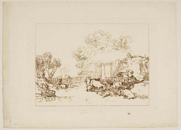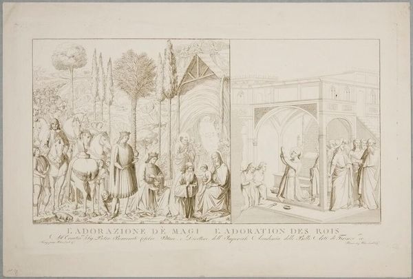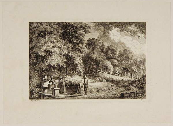 Editor: This is Auguste-Louis Lepère's "Notre Dame Seen from the Pier of Montebello." It's a lovely print, but the lines are so delicate it almost feels unfinished. What formal elements stand out to you? Curator: The composition is quite deliberate, despite its seeming spontaneity. Note how the skeletal trees frame Notre Dame, acting as a visual bridge between the foreground figures and the architectural mass. The artist uses hatching to create depth and volume, strategically varying the density to suggest light and shadow. Do you see how the perspective pulls you into the scene, toward the cathedral's facade? Editor: Yes, now that you mention it, the lines do have a structured purpose. So, it's not unfinished, but intentionally suggestive? Curator: Precisely. Lepère uses minimal means to evoke a specific place and atmosphere. The linear quality emphasizes the flatness of the picture plane, while simultaneously creating an illusion of three-dimensional space. Consider how the artist uses line and tone to achieve that delicate balance. Editor: That is really insightful, thank you! I had a fixed idea about the lines which blinded me. Curator: Indeed, these subtleties are easily overlooked, but they ultimately define the artwork's character.