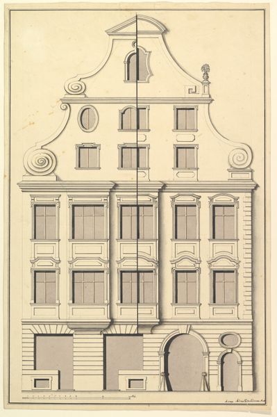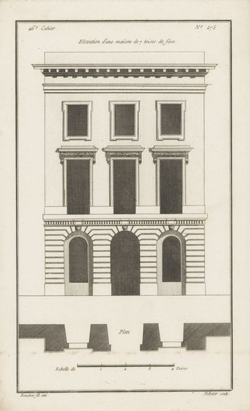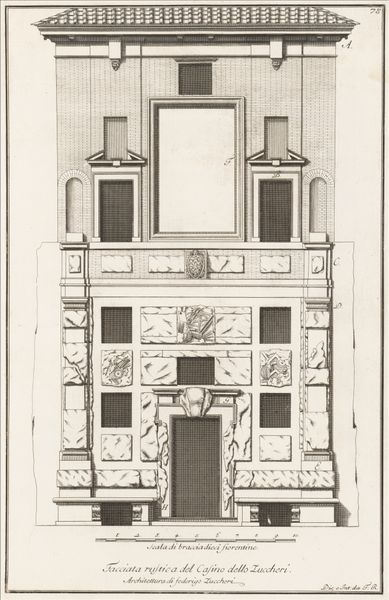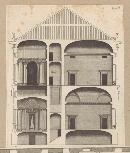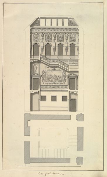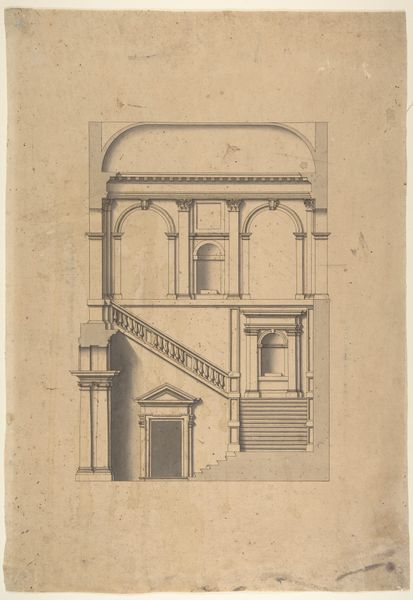 Curator: Let’s take a closer look at Isaac Ware's "End of Staircase, Houghton Hall, Norfolk," a print dating back to 1735. You can find it here at the Met. What strikes you about it initially? Editor: It's remarkably austere, almost chilling. Despite the grandeur of the architectural subject, the pale, precise lines lend it a clinical, diagrammatic feel rather than one of opulent baroque dynamism. Curator: Interesting. As a drawing and engraving, it really emphasizes line and form, doesn't it? It's not just a representation but almost a dissection of the architectural space. Ware was deeply involved in the construction process, so that hands-on knowledge definitely informs his precise depiction of the staircase and its decorative elements. The materials – the paper, ink, the plates used to produce this—were the currency with which ideas of design circulated. Editor: Precisely! You know, beyond the obvious design elements—the baroque flourishes, the suggestion of neoclassical order – what interests me is what's implied. How many hands were involved in realizing this vision, not just in its design on paper but also in building and decorating a space like this? Curator: Absolutely! We are only seeing one artist, but this represents an army of craftspeople, stonemasons, sculptors... all collaborating. Think of the labor, the transportation of materials, the complex logistics of 18th-century building practices, and the layers of hierarchy! Each individual contributing to a whole that dwarfed any single contribution. Ware’s design merely facilitated, gave permission for a flurry of material and physical exertion. It is funny to call a flat artwork so layered and 3-Dimensional in a human sense! Editor: And who ultimately gets to enjoy it? It highlights this massive divergence, this incredible contrast between artistic inspiration and material reality on one hand, but on the other also a sharp divide between the labor of making it real, versus the elite’s pleasure of occupation. Makes me wonder who the real artist is, and for whom all of this creation unfolds. Curator: That's a powerful question to leave with our listeners. The print then becomes a portal— not just into an architectural space, but also into a complex social landscape. Editor: Precisely! It certainly makes me appreciate the incredible tension residing inside, something that on its surface seems like a harmless design blueprint.