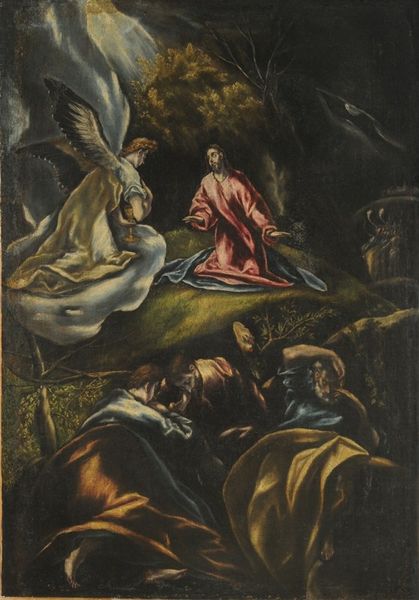 Editor: We're looking at "The Three Maries at the Tomb," an oil painting. It appears to be from the Baroque period. The scene is really dramatic, especially with that bright light emanating from the tomb. What historical context can you share about how it might have been received? Curator: Baroque art often served as a powerful tool for the Catholic Church, especially during the Counter-Reformation. This piece, depicting the resurrection narrative, played into that. It was all about emotional intensity, religious fervor, and visually reinforcing doctrine. The theatrical light, the figures’ exaggerated emotions - all meant to inspire awe and faith in the viewer. What role did these kinds of paintings have at the time? Editor: So, it wasn't just art for art's sake, but actively participating in religious and political movements? Curator: Exactly. Artists like Giordano were creating powerful propaganda, shaping public perception and reinforcing institutional power. Consider the intended audience: Did this resonate more with certain social classes than others? Editor: Probably the illiterate who were taught by images since they could not read the scripture. This use of painting to convey specific narratives, it feels different than what we expect art to do today. Curator: Precisely! The modern museum shapes our understanding, but we need to remember the initial intent of works like these, how they were integral to societal and religious structures. Editor: That makes me look at it in a completely new way. Instead of just admiring the technique, I can see its role in shaping beliefs and reinforcing power. Thank you! Curator: And hopefully, this conversation helped you appreciate the multifaceted role art can play in shaping society and culture.