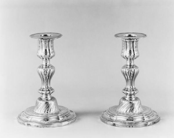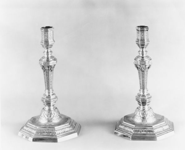 These candlesticks, crafted in silver by an artist known only as N.H., present a study in contrasts and balances. The reflective surfaces play with light, enhancing the intricate engraved patterns. Notice how the octagonal tops transition into bulbous, ornamented stems, a nod to classical forms, yet subverted with a more ornamental exuberance. This play between geometry and curvilinear shapes destabilizes any singular stylistic categorization. Consider the candlesticks as semiotic objects; they transcend mere functionality, symbolizing status and taste. The repetitive motifs, while decorative, can also be interpreted as a coded language, reflecting the values and cultural codes of their time. The delicate balance achieved between form and decoration invites us to reconsider how objects can embody cultural narratives.