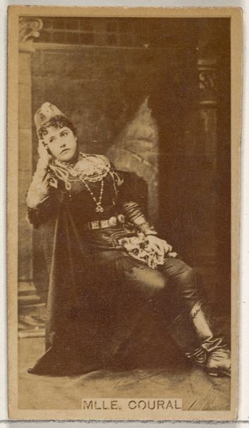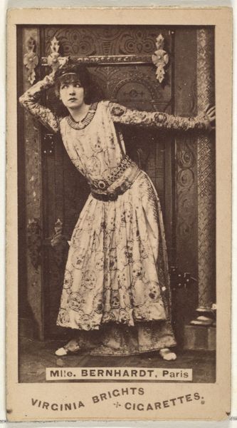 Editor: This is “Francis Wilson, from the Actresses series,” a photograph printed around 1890 by the Kinney Brothers. I’m struck by how theatrical it is – his costume, the pose, even the slightly faded sepia tone gives it a performative quality. What can you tell me about the role this image played at the time? Curator: It’s a fascinating intersection of commerce, celebrity, and evolving notions of performance. Kinney Brothers, a tobacco company, used these images – initially marketed as part of an “Actresses” series, despite the subject being male – to promote their Sweet Caporal Cigarettes. How do you think framing Wilson as an “actress,” even satirically, affected his reception? Editor: I guess it blurred the lines between traditional gender roles. Was this common in advertising? Curator: Not overtly. The late 19th century was a time of significant shifts in social norms. Consumer culture, especially in burgeoning urban centers, provided a platform to play with those norms, albeit within a carefully managed context. By using these figures on trade cards handed out with tobacco, Kinney Brothers put them in mass circulation, attempting to capture both male and female attention. What assumptions about gender and class can we infer based on the product being marketed with these images? Editor: I see… So, these cards became miniature billboards inserted into everyday life, subtly shaping public perceptions. Curator: Exactly! And their survival speaks volumes about their perceived value. Were they collected? Shared? Thrown away? The choices made by individuals engaging with these cards added further layers of meaning beyond their intended commercial function. Editor: I hadn't considered how interactive a small piece of advertising could be. This changes how I view its historical weight. Curator: These seemingly insignificant images offer insight into the complex interplay of art, marketing, and social change. Thinking about images like these teaches us how socio-political powers play an enormous role in imagery, both then and now. Editor: Definitely a new lens to consider when evaluating historical images. Thank you for the lesson!