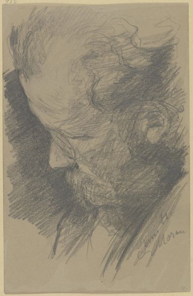Curator: Before us we have a compelling drawing, "Portret van Jozef Israëls," a work executed circa 1884-1911, attributed to Jan Veth, here at the Rijksmuseum. Editor: It’s a somber, almost melancholic portrait. The sketch-like quality, the charcoal strokes left quite visible, creates a raw, unfinished feel that adds to the mood. Curator: Indeed. Veth has employed a variety of dry media – graphite, charcoal, possibly some pastel – to create depth and shadow. Observe the contrast between the roughly sketched background and the more carefully rendered face. Editor: The sitter’s gaze is averted, thoughtful. The spectacles, however, give him an intellectual air, connecting him to the world of ideas. It prompts reflection about the artistic and political contexts of his time. Who was Jozef Israëls? How was he perceived? Curator: Jozef Israëls was a highly regarded painter of the Hague School, known for his realistic depictions of Dutch peasant life. Veth, also an artist and critic, likely knew Israëls within the Dutch art scene. This portrait is then also about paying tribute. Editor: A visual marker of the dynamics of that artistic community! I see the subtle social power, the critical reception, all captured in these lines. But consider also, formally, how the composition leads our eye, note how all of the shading creates a system of meaning. Curator: Notice also, the play of light and shadow, it guides our eye around the composition but adds also to the psychological intensity. The face seems to emerge from the darkness, emphasizing the character and presence. Editor: I wonder about the intentionality. Was this preparatory sketch, an informal study, or a more deliberately considered piece to circulate among peers? This piece can be more of an act of building relationships than we think at first. Curator: Perhaps it functioned as both, capturing the essence of the man while also serving as an exercise in form and technique. It highlights Veth’s mastery of capturing likeness with minimal means. Editor: It’s a powerful reminder how portraits always negotiate power and relationships in art world history. And also an elegant example of rendering light and dark to amplify meaning. Curator: I agree. Its suggestive use of shading creates a lingering image of memory. Editor: It’s this dynamic tension of skill, mood and socio-political that keeps this portrait vibrant.