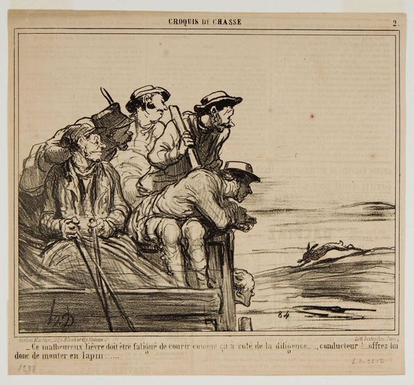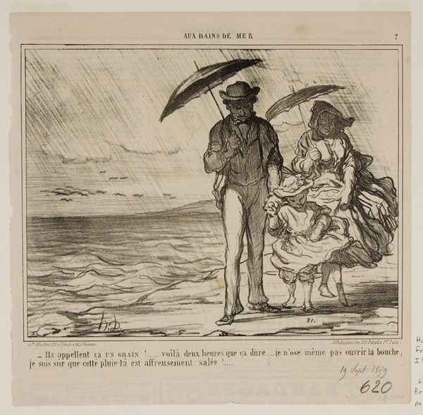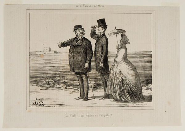Editor: This lithograph by Honoré Daumier is titled "What put it into your head, Adelaide, to go spend our Sunday in the country?...we would have been so much better off at home!....". It looks like a disgruntled couple sitting outside. What can you tell me about it? Curator: Daumier often used his art to critique bourgeois society. This image speaks volumes about gender roles and expectations, doesn’t it? Consider the husband’s obvious discomfort versus Adelaide's stoic demeanor. Editor: I see that. Maybe she's trying to enjoy the outing despite his complaining? Curator: Exactly! Daumier cleverly highlights the power dynamics within marriage and the societal pressures placed on women to maintain appearances, even when their own desires might be different. Editor: So, it's not just a funny image, but a commentary on social norms. Curator: Precisely. It invites us to question whose "better off" the husband is really considering. Whose comfort matters most in this relationship, and more broadly, in society? Editor: I never thought of it that way. This makes me see Daumier's work in a completely new light. Curator: It reveals that art, even seemingly simple cartoons, can be powerful tools for social commentary and change.