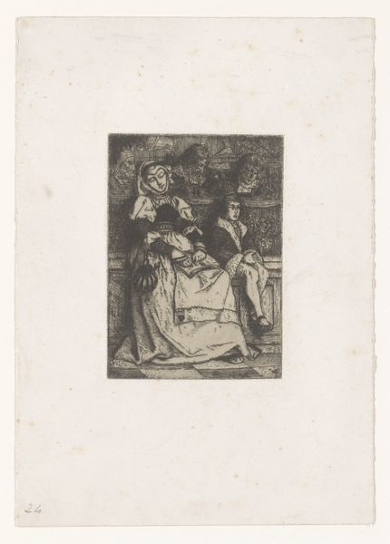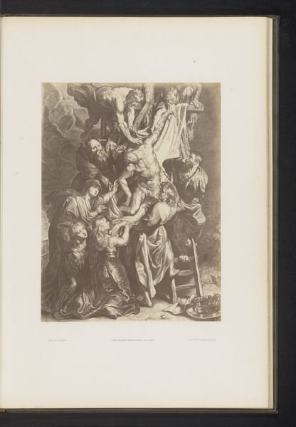 Editor: So, this is Édouard Manet's "Dead Christ with Angels," an etching and print from around 1866 or 1867. It’s striking how dark and moody it is, even though it’s relatively small. The figures almost seem to emerge from the shadows. What stands out to you when you look at this piece? Curator: The emotional and psychological weight of this image is palpable. Manet here engages with a tradition steeped in religious symbolism, primarily Baroque themes. The body of Christ, surrounded by angels, is instantly recognizable, but Manet alters our relationship to these known archetypes through very distinct image-making. Editor: How so? What specific details are significant? Curator: Look at the light. Notice where it pools, and how it illuminates the wounds. Light and dark – *chiaroscuro* – are tools to trigger very specific emotions. What do the angels evoke? What are *they* looking at? It’s a scene of mourning, yes, but what *kind* of mourning? How might this contrast with earlier Renaissance depictions of the same scene? Editor: I see what you mean. The angels are less serene and more...human, maybe? More actively grieving. And Christ seems very vulnerable. It's a much more raw depiction of the crucifixion than I'm used to. Curator: Exactly. Manet isn’t just depicting a religious scene; he’s exploring the human experience of grief and loss. The cultural memory embedded in this image collides with Manet's contemporary world, prompting new understandings and empathy, all triggered through powerful symbolism. Editor: I hadn’t thought about it that way, but I can see how the familiar religious symbols are being used to express a very human and contemporary emotion. Thanks for pointing that out! Curator: My pleasure. It's in these reinterpretations that we find new dimensions of meaning within the artistic traditions we inherit.