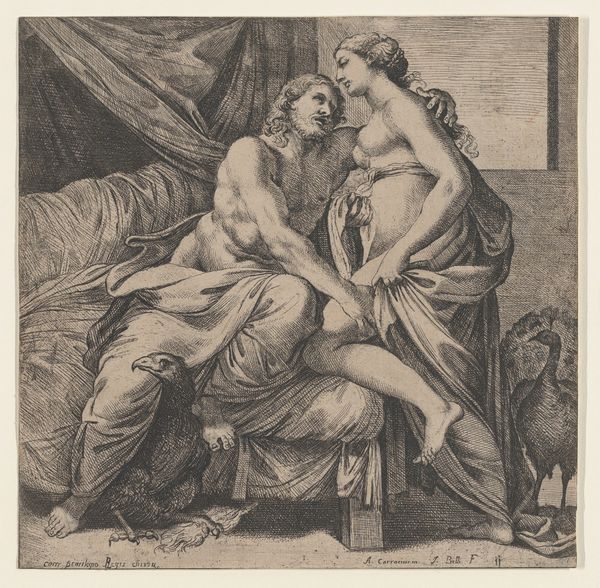 Editor: We're looking at "Venus en Amor," an engraving dating between 1659 and 1740 by Jan van der Bruggen. It's got a real Baroque feel with all that dramatic shading. I am mostly struck by how intimate it seems... a goddess at rest with her son. What do you see in this piece? Curator: Intimacy is key, I think. Consider the texture of the engraving itself, the lines pressed into paper – that tactility speaks to the closeness. I am struck by this balance between the eroticism inherent to such depictions and the more tender mother-son vibe that is at play, but is that truly what we are looking at? The artist forces us to consider our expectations... Look closer: isn't the figure of Venus rendered with a deliberateness which flirts with—how to put it?—a certain theatricality, like they are a part of the performative element inherent to this genre? Editor: A performance? Like they are aware of being watched? Curator: Perhaps... and does that recognition take away from your initial read of an "intimate moment?" Consider, too, the very conscious decision of van der Bruggen in using line, of all things! I find line work can carry an almost aggressive power. He is playing with fire! Editor: That’s an interesting point. The lines do seem very deliberate, almost… bold. They contrast so strongly with the soft subject matter. I didn't think of it that way initially, but now I see what you mean. The bold engraving undercuts any assumed or expected quietude or softness that the "mother and child" depiction may initially project. It is so subversive, really. Curator: It's precisely this tension—between tenderness and the assertive line—that, for me, elevates this above simple Baroque figuration. You have your answer, my friend!
