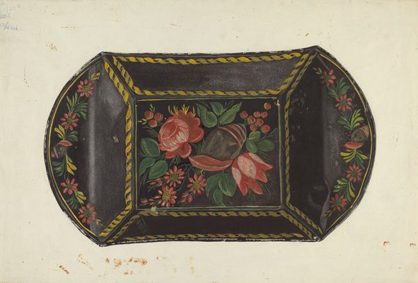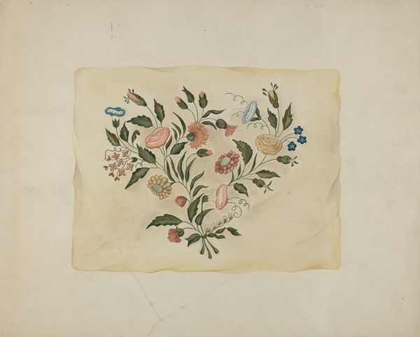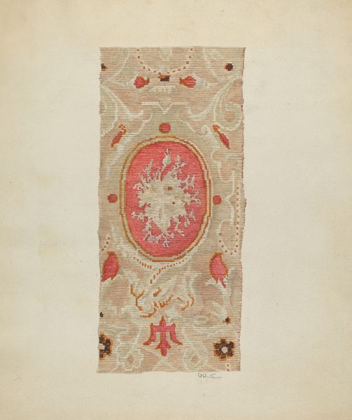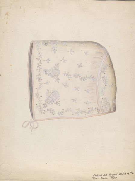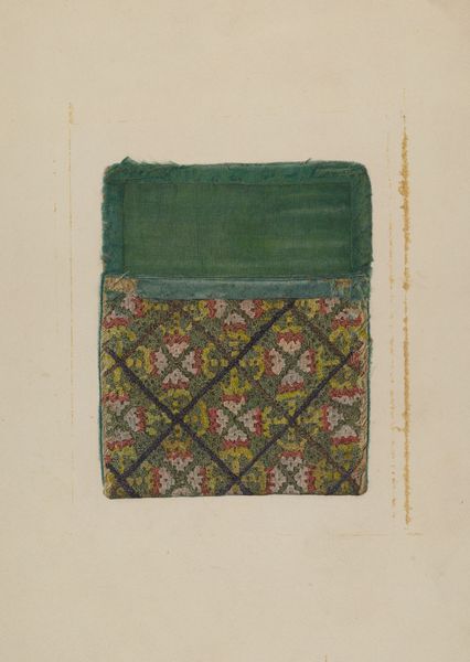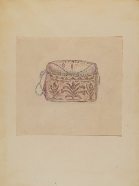 Editor: Here we have Eleanor Alexander’s "Purse," a watercolor and coloured pencil drawing on paper created sometime between 1935 and 1942. I'm struck by how delicately the textures are rendered. What do you see in this piece, looking at it from your perspective? Curator: The most compelling aspect of this drawing is its engagement with the interplay of form and surface. Notice how the artist meticulously captures the tactile qualities of the fabrics. The juxtaposition of the smooth pink lining with the intricately patterned floral embroidery presents a captivating textural contrast. We can analyse the semiotic relationships, discerning meaning from the visual vocabulary presented, looking at the color and pattern. Editor: That's interesting. I hadn't considered the textural contrasts so deliberately. Curator: Observe how the coloured pencil work defines the embroidered area, adding another layer of complexity. Consider the compositional choices—how the artist uses line and color to guide the viewer's eye and how they build a sense of volume on a flat plane. Can you see it? Editor: I do. The shadowing creates depth, and now that you mention it, the composition does feel very deliberate. So, without relying on the object itself, or its intended purpose, we can find richness by analyzing its intrinsic visual elements. Thank you. Curator: Indeed. It underscores the potential of drawing as a means of dissecting visual components such as line, shape, and the formal tension created between areas of colour, and this unlocks further meaning within the representation.