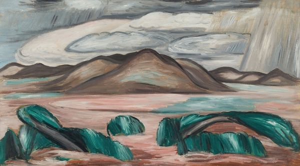 Curator: Look at this painting. Marsden Hartley, "Landscape No. 5," made somewhere between 1922 and 1923. It practically vibrates with geological tension. Editor: It feels almost claustrophobic, doesn't it? Despite being a landscape, there’s a lack of that sweeping, airy perspective we usually associate with the genre. More rock, less sky, everything rendered in these assertive, blocky forms. Curator: Exactly! He’s turning landscape into a tangible, almost brutalist experience. See how he uses oil paint, laid on thick in some areas, to give a real sense of weight and texture. You can almost feel the heat radiating off those sun-baked cliffs. Editor: I find myself drawn to the deliberate construction of the canvas. Oil paint lends itself to certain industrial modes, doesn't it? The visible brushstrokes and simplified forms hint at a process, almost a layering, not unlike bricklaying or plastering. The landscape becomes a constructed entity. Curator: You’re picking up on something vital, I think. Hartley wasn’t interested in simple representation. This isn't about *resembling* a landscape; it’s about evoking its elemental power. He felt, I believe, deeply connected to nature as a source of raw emotional experience. He distills it to geometric blocks but those triangles… They remind me of certain melancholic chords in music. Editor: It also makes me think about the sheer physical labor involved in creating something like this. All that pigment, painstakingly mixed and applied. Hartley's engagement with his materials elevates it beyond mere visual pleasure. He transforms natural formations through calculated engagement with available tools. Curator: There is, isn’t there? An intimacy created through physical engagement. It's like he’s wrestling with the earth itself on the canvas. Editor: This conversation invites so many ways of looking – a productive tension between our perspectives. I leave with fresh admiration for materiality, not just imagery, informing artistic expression. Curator: Me too! And for that elemental expression distilled in landscapes to connect, and inspire.