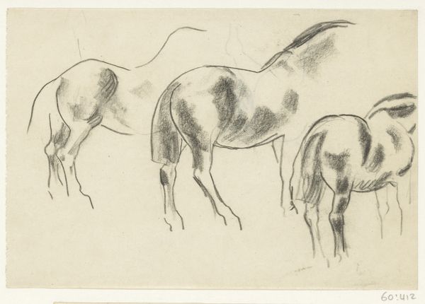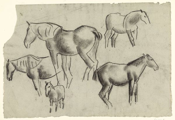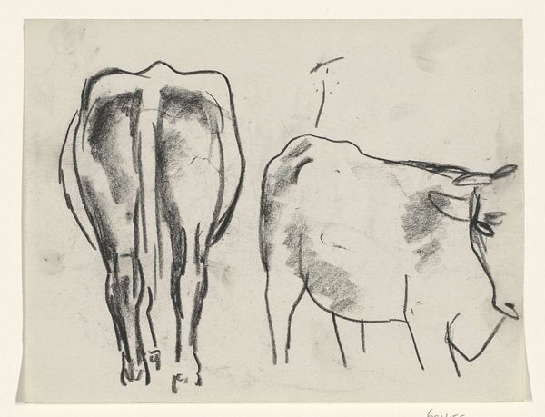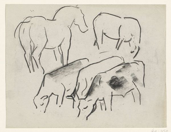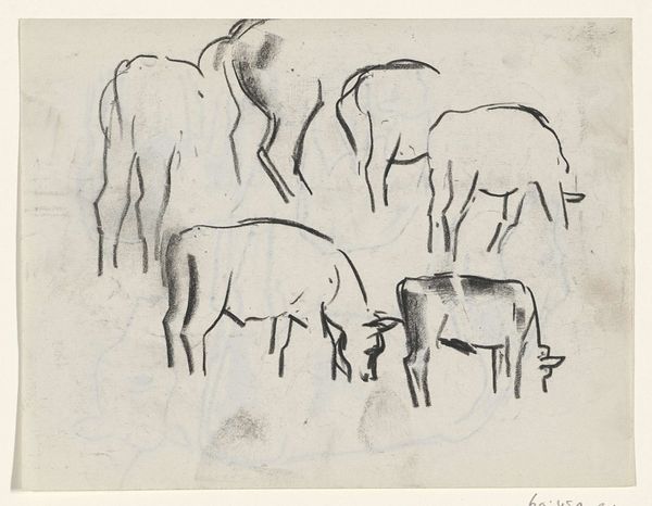 Leo Gestel made this drawing of grazing cows and horses with chalk or charcoal on paper. The material itself is modest, common, and immediate, perfect for capturing a quick impression. Gestel’s lines are economical, seemingly dashed off, yet they skillfully evoke the animals’ forms and postures. The rough texture of the chalk creates a sense of volume and weight, particularly in the shading of the larger cow. This choice of material, combined with Gestel’s technique, gives the work a raw, almost primal feel. You get the sense that the artist was less interested in refined detail than in capturing the essence of these animals in their natural environment. The drawing’s strength lies in its simplicity and directness. Gestel’s work reminds us that even the most ordinary materials, when handled with skill and insight, can yield extraordinary results, blurring the lines between a sketch and a finished artwork.