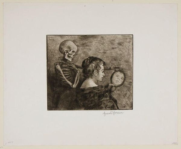 Editor: So, this is Edvard Munch's "The Dead Mother and Her Child." It’s pretty stark, a monochrome etching. It gives me the shivers – the kid’s covering her ears, seemingly horrified. What do you make of this, our Munch moment? Curator: Oh, darling, Munch always pulls at the heartstrings, doesn’t he? I see a raw, unflinching glimpse into grief. That child, frozen in a silent scream, embodies the universal terror of loss. Munch knew grief firsthand. Does that context shift how you see the image? Editor: Definitely. It’s not just scary; it's… vulnerable. I get the sense that this etching might have been a way for Munch to express his own childhood trauma. Curator: Precisely. Art is a powerful mirror, reflecting both the artist’s soul and our own. This one is devastating, but it's brutally honest too. Editor: I totally agree. I'll never look at a Munch the same way.