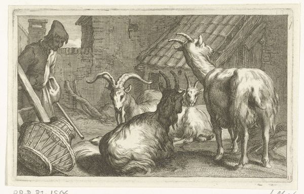 This is an etching by an anonymous artist titled “Two dogs near a basket with food”. The composition, dominated by linear marks, is characterized by its density and dynamic arrangement of shapes and textures. The eye is immediately drawn to the two dogs and the basket of food, meticulously rendered with dense, cross-hatched lines. These marks define the forms of the dogs and the various textures, from fur to flesh. The artist destabilizes conventional still life arrangements. The inclusion of the dogs introduces a narrative element, suggesting themes of desire and consumption. The inscription on the chair adds another layer of semiotic complexity; we can only wonder what the artist is trying to tell us. The etching’s power comes from its formal qualities – how line, texture, and composition work together to create an unsettling yet intriguing visual experience. The artwork invites continuous interpretation of its visual and symbolic elements.