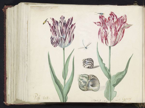 Curator: Here we have Jacob Marrel's "Two Tulips with Cricket, Snail and Butterfly", a watercolor and tempera piece dating back to 1640. It resides here at the Rijksmuseum. Editor: It's surprisingly vibrant for its age. There's something fragile and ephemeral about it too, like a moment captured between seasons. Curator: Dutch Golden Age botanical art served many functions beyond mere decoration. Remember the Dutch passion for tulips—tulip mania had gripped the nation. Paintings like this served almost as catalogs, documenting varieties. These meticulously detailed renderings elevated certain species. Editor: Elevating is an understatement. I'd argue that tulips were a form of currency, accessible mostly to privileged, white, straight, cisgendered males. It raises questions about access, the power structures determining worth, doesn’t it? Who gets to possess and celebrate beauty? Curator: I agree that it hints at societal stratification of that era. Art also often reflects wealth, of course, especially with rare species. Note the incredible details: the velvety texture of the petals, the intricate wings of the butterfly, even the slime trail of the snail. The level of skill on display here… it was very prized! Editor: It’s also unsettling. The presence of insects—a cricket and snail as well, feels deliberate. Are we to think about mortality? Nature's resilience against human intervention perhaps? What do those creatures say about our relationship with the natural world? Curator: It introduces a narrative element, beyond pure scientific cataloging. There is tension: the tulips symbolize beauty and prosperity but are surrounded by a suggestion of nature's other cycles, cycles of decay. Editor: That is such an interesting point. Decay is part of life. By bringing those elements into the rendering, perhaps Marrel sought to democratize access to conversations. What does beauty mean if it cannot last? Curator: That’s something to contemplate, the tulip's symbolism coupled with natural life cycle of each subject. A compelling discussion for us to end on! Editor: Indeed. It urges us to acknowledge beauty's fleeting essence and the systemic forces shaping our perceptions. I agree. Thank you.