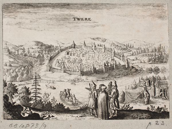 Curator: It feels almost theatrical, this meticulous cross-hatching bringing a far-off city to life. There’s a strange calm to it, considering the implied scale. Editor: We're looking at an engraving titled "Saba," created in 1647. Though its author is unknown, this print resides in the collection of the SMK, Statens Museum for Kunst. It's a compelling early modern depiction of an Islamic cityscape. Curator: Cityscapes have always held a certain symbolic power, promising journeys into the unknown. Here, the unknown is visually codified with camels in the foreground. What might "Saba" have meant to European audiences in the 17th century? Editor: It's important to remember that European encounters with Islamic culture at the time were mediated through trade, conquest, and theological debate. Representations, like this one, were caught up in these power dynamics, informing, and also likely misinforming European viewers. The precision of the engraving implies authority and factualness. Curator: The way the buildings are stacked, one atop another, suggests a sort of timeless quality. Even the walled perimeter lends itself to thinking about psychological barriers – the seen versus the unseen, the known versus the mysterious East. Editor: Precisely. Notice, also, the level of detail in the rendering of architectural elements and topographical features—elements European powers aimed to chart for strategic purposes. It hints at burgeoning imperial ambitions and the desire to categorize and possess. Curator: The single standing camel seems poised, almost an intermediary, an animal perfectly designed to traverse symbolic boundaries. Its gaze draws us toward that grand city in the distance, where so many human narratives intertwine. It becomes an invitation to contemplate the layered history imbued in that single word – "Saba." Editor: Ultimately, this image serves as a fascinating glimpse into how early modern Europeans constructed ideas about distant cultures, and it underscores how art participates in constructing our collective understandings of the world.