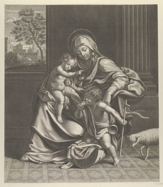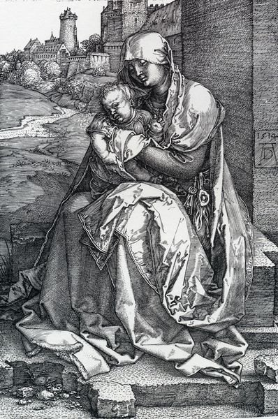 Albrecht Dürer created this engraving, Virgin and Child Seated by the Wall, in 1514, during a period of immense religious and social change in Europe. Dürer situates the Virgin Mary and her child in a humble, human context. She sits wearily, and the Christ child seems almost to slumber in her arms. This intimacy suggests the profound emotional bond between mother and child. But Dürer also weaves in symbols of wealth and status. The Madonna’s garments fall in voluminous folds, and her belt and the Christ child’s coral necklace draw the eye. The setting, dominated by the looming architecture of a grand fortress, provides a visual narrative about power, security, and the roles of religious figures within society. How does this depiction contrast with the traditional portrayals of the Virgin Mary during the Renaissance? What does it convey about the complex intersections of faith, motherhood, and social status during Dürer's time?