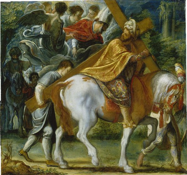 Editor: So, this is "The Abduction of Rebecca," an oil painting by Eugène Delacroix from 1846. There’s such raw emotion pouring from this canvas. The woman’s limp form, the frantic energy… it’s intensely dramatic. How do you interpret this work, given its historical context and Delacroix's Romantic style? Curator: Oh, Rebecca! Doesn't it just stir something primal in you? This isn't just paint; it’s a fever dream. Delacroix wasn't simply depicting a historical moment—it is an operatic spectacle, the chaos, the struggle, all under this sky that looks like it's about to swallow the world whole. Notice how he uses light, almost weaponizes it, against the shadowy forms. Does it feel staged or genuine? Editor: It feels theatrical, but still captivating. I notice the castle burning in the background - how does that fit into the narrative? Curator: Ah, the burning castle! That backdrop is less about literal destruction and more a reflection of inner turmoil, wouldn't you agree? This scene isn’t just about abduction; it is about conflict, religious, and emotional! I see Rebecca's resistance, the kidnappers’ urgency, it becomes a timeless ballet of opposing wills. Editor: That's such an interesting way to see it. I had been focusing on the literal narrative, but I like thinking of it as a clash of wills playing out on a bigger stage. Curator: And isn't that the delight of Delacroix? He hands us the story, but invites us to feel its pulse. These weren't illustrations but visceral expressions of freedom and identity in the garb of Romanticism! Editor: Exactly! I'll never look at an abduction scene the same way again. Thanks!