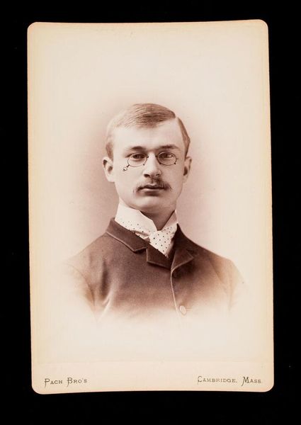 Curator: This is a cabinet card portrait of George Pope Furber, produced by Pach Brothers, a well-known photography studio in New York. Editor: There's a quiet confidence in his gaze, and that carefully cultivated mustache, of course. The brown tones are so soft. Curator: Yes, cabinet cards like this were mass-produced, a form of accessible portraiture. Think of it as the Victorian era's Instagram profile. Editor: The surface of the print, that subtle sheen, it speaks of the alchemic process. Pach Brothers clearly understood how to manipulate light and chemistry to create an enduring image. Curator: And this "enduring image" hints at the sitter’s social status; a lasting, public-facing presentation, manufactured for posterity. Editor: It reminds us how photography democratized portraiture, enabling more people to shape their image. Curator: Exactly. We must remember that this image is not only of him, but also represents the social and technological changes of the time. Editor: Indeed, a powerful reminder that every artifact, even a simple portrait, tells a story of material and meaning.