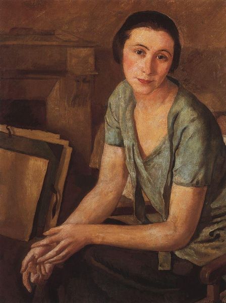 Editor: So, here we have Zinaida Serebriakova's "Portrait of E.I. Finogenova" from 1920, beautifully rendered with watercolor and possibly oil, it looks like. There's this serene, almost melancholic quality to her gaze, and a softness about the whole composition... what catches your eye? Curator: Ah, yes, Finogenova. Doesn’t she remind you of a pre-Raphaelite muse, transported to the stark realities of post-revolutionary Russia? Serebriakova painted this during a period of immense hardship, yet the painting whispers of intimacy and a quiet inner life. I'm struck by the cool palette, almost monastic, which somehow amplifies the warmth in her auburn hair. Have you noticed how the loose brushstrokes create this feeling of movement, of fleeting time? It’s a fragile beauty, don't you think? Editor: Absolutely. That fragility is palpable, especially given the historical context. It’s like Serebriakova is trying to preserve a sense of grace amid chaos. The lighting is incredible as well, really brings forward her complexion. Curator: Precisely. She captured that inner luminosity… almost as if painting the soul itself, right? And think about the power of that gaze. Where do you think she's looking? What’s she seeing? I find that question pulls me deeper and deeper into the painting. It invites speculation! Editor: A bit of hope maybe? A future beyond what's visible? I’m struck by how modern it feels, even though it's a hundred years old. Curator: Modern indeed! And to think, Serebriakova was often sidelined simply as a ‘portraitist.’ To me, that is a dismissal, or a terrible waste. With works like these, she wasn’t just painting faces; she was charting emotional landscapes, echoing the spirit of an era on the precipice of monumental change. What a witness. What an artist! Editor: It’s like the painting breathes with its own silent stories. Now I'm finding a wealth of personal experience behind her intimate style! Thank you so much for pointing that out. Curator: My pleasure entirely! Perhaps all art does, really, is offer a fleeting glance at the world through another’s eyes. A borrowed vision.
