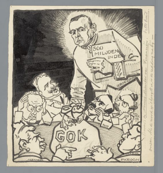 Curator: Here we have Clifford Kennedy Berryman's 1941 ink drawing, "Something Else to Think About." It depicts Mahatma Gandhi writing at the bottom with a massive tank looming behind him. What strikes you initially about this piece? Editor: Well, the sheer weight of that tank visually crushes everything beneath it. The cross-hatching gives the metal an imposing density, highlighting the materiality of war itself. There's a brutal contrast between the instruments of peace and violence. Curator: Absolutely. Berryman crafted this political cartoon during a tumultuous period—just before the U.S. entered World War II. We must consider the historical tensions and shifting global power dynamics at play. It is layered in meanings about America’s role in aiding Britain, and Gandhi's simultaneous appeals to non-violence. Editor: Precisely. The means of production, these war machines, are being directly juxtaposed with Gandhi’s non-violent philosophy, which itself has specific material realities and is rooted in localized practice. He's seated on the ground, writing by hand. It points out an undeniable disparity. Curator: It's also about the politics of representation. How does the U.S. press and political landscape portray Gandhi? There is a great irony because he holds a sign urging "America [to] think 50 times before giving further aid to Britain." Berryman spotlights the complexity, or even hypocrisy, of isolationist sentiments. Editor: Yes, and there is a tangible sense of urgency in Berryman's ink work; frantic energy. This contrasts with Gandhi's posture of serene concentration despite the very loud statement that looming Nazi tank makes. How do these elements play off one another, commenting on the labor involved, on both sides? Curator: Berryman, in his cartoon, forces a recognition of these vastly different approaches to resistance and geopolitics, raising pertinent questions about the complexities of allegiance, ethics, and the encroaching global conflict. It speaks to the need for America to consider multiple vantage points before acting. Editor: A potent and disquieting piece indeed, urging us to ponder the true costs of even the most high-minded ideals during moments of massive material transformation and conflict. It’s about the material reality of war, weighed against pacifism.