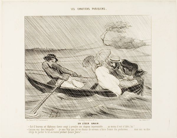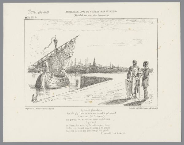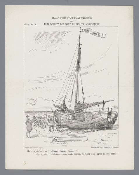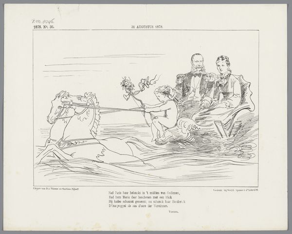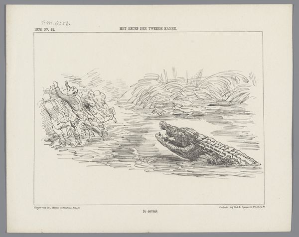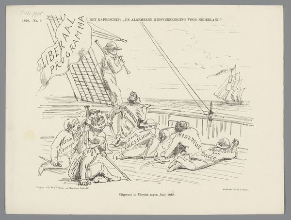 Editor: Here we have a political cartoon by Johan Michael Schmidt Crans, from 1871, titled “Spotprent op Minister Van Bosse en gouverneur-generaal Mijer, 1871”. It's a line drawing, looks like a print. There’s an odd combination of serenity and, I don't know, impending doom, maybe? The tiny figures feel very exposed. What do you see in it? Curator: I see a visual embodiment of power dynamics, rendered through symbols deeply rooted in colonial history. Note how the Dutch minister in "N. Holland," representing the Netherlands, is connected to "Java" by a taut line – a symbol of control and exploitation. The figures, dwarfed by the ocean, suggest the overwhelming power dynamic at play. What emotions does that provoke in you? Editor: Definitely a sense of unease. It feels imbalanced. The small child-like figure in "Buitenzorg", representing the Governor-General, seems almost oblivious to the tension. And that crocodile lurking beneath "Java" is a bit alarming. Is it about threat of some kind? Curator: Precisely! The crocodile becomes a potent symbol – a silent threat, representing the ever-present potential for rebellion, the natural order pushing back against colonial imposition. Notice too, how the idyllic sailing ships in the distance create a false sense of peace, masking the underlying tensions depicted in the foreground. Does this alter your perception? Editor: Absolutely, the juxtaposition highlights the hypocrisy of the colonial narrative. A sunny outlook with subjugation right underneath. Is it unusual to use marine imagery like this for commentary? Curator: Cartoons often tap into familiar cultural symbols to deliver a point quickly. The sea is used as a conduit between colonies and home nation; what happens beneath the surface becomes meaningful, and quite unsettling, which appears to be precisely the goal of this piece. Editor: It's amazing how much symbolism is packed into this seemingly simple image. I see it so differently now. Curator: And I am struck by the directness of the imagery, its unvarnished portrayal of colonial ties. I didn't expect such direct critique of governance in such a drawing.