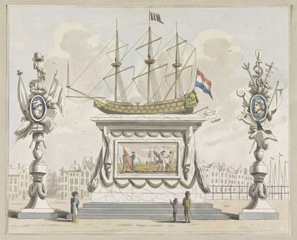 A. Verkerk made this print of a decoration in the Nieuwmarkt in 1795. It was made using an etching technique, a printmaking method in which lines are incised into a metal plate with acid. The fine lines of the print allow for intricate details, seen especially in the depiction of the ship, allegorical decorations, and the architecture of the square. The etched lines create a sense of depth and texture, which gives volume to the image and emphasizes the monument's presence in the public square. The print refers to the Dutch Republic's maritime power and commercial prowess, with the ship symbolizing trade and exploration. As such, the print suggests an association between artistic creation, historical commemoration, and the economic activities that shaped the Netherlands during the 18th century. This association reveals how deeply enmeshed the world of art was with maritime trade.