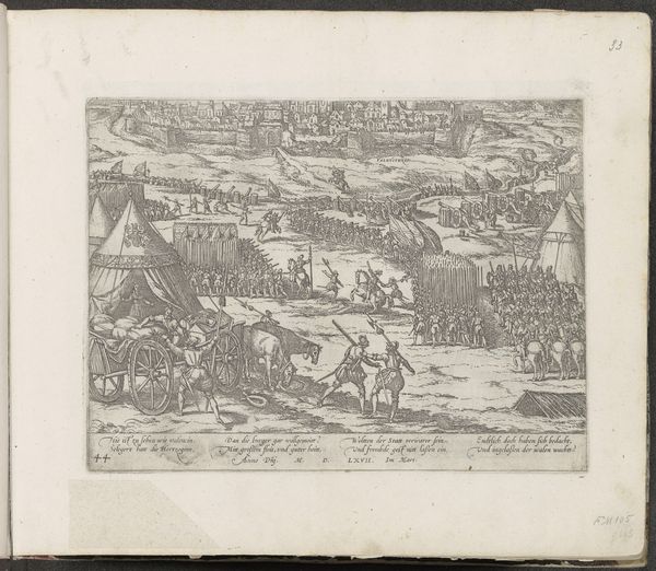 This black ink drawing from 1610 by Frans Hogenberg depicts the ‘Expulsion of the Walloon troops near Reckum’. Hogenberg was a Flemish engraver and mapmaker, who lived through a time of great religious and political upheaval in Europe. This image offers a window into the early 17th century, a period marked by the Dutch Revolt against Spanish rule, where the fault lines of identity, religion, and power intersected. What does it mean to be ‘Walloon’ in this context? The term refers to the French-speaking people of present-day Belgium, who were then under the rule of the Spanish Habsburgs. Their expulsion from Reckum symbolizes the broader struggle for Dutch independence and religious freedom against perceived foreign oppressors. Consider how Hogenberg’s depiction of the Walloon troops might reflect the biases and perspectives of his own cultural and political context. What narratives are being reinforced, and what stories are being silenced? This artwork prompts us to reflect on the complexities of identity, belonging, and the enduring legacy of conflict.
