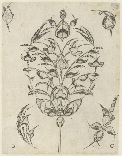 Curator: This engraving, executed in 1596 by Daniel Mignot, is entitled "Brooch with Table-Stones, Butterflies at Top, and Peacocks and Hermes at Bottom." Editor: It's stunning. The graphic arrangement feels incredibly contemporary despite being centuries old. It has an architectural rigidity balanced with these delicate, almost whimsical elements. Curator: The "line" really commands our attention here. Observe the symmetry, the geometric precision. Mignot's expertise lies in deploying a network of hatching and cross-hatching to build tone and dimension. This print showcases the Mannerist style through exaggerated forms. The composition seems preoccupied with the aesthetics of design. Editor: Looking beyond its formal construction, I am drawn to the complex symbolism and implicit narrative within this brooch design. The presence of Hermes, for instance, points to commerce and exchange. While the peacocks could evoke wealth or vanity. The butterflies too are intriguing, representing metamorphosis or the soul. I’m led to think of this object not just as a design for adornment but as a status symbol. What does its ornamental quality reveal about wealth and access? Curator: Undoubtedly, this print served a functional role as a template for artisans. Consider, however, how the medium of engraving—with its capacity for dissemination—democratized design ideas. Did it inspire creativity, or did it reinforce established tastes among artisans? The "form," I believe, becomes paramount. The details support the formal essence of design itself. Editor: Yes, its wide circulation probably disseminated certain values. It underscores that even seemingly decorative objects have encoded social meaning and served specific audiences. It leaves one questioning what it might mean to reclaim or repurpose these emblems within today’s contexts. Curator: I find it satisfying that our dialogue returns me to the sheer virtuosity embedded in these meticulously rendered lines. Editor: And I remain anchored in thinking of this object and all artworks as agents embedded within power structures that persist across generations.