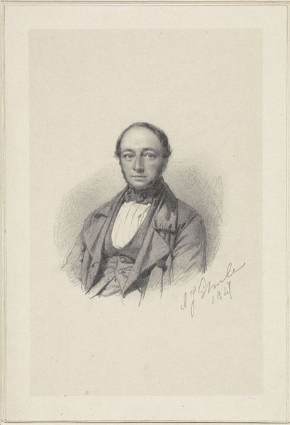 Curator: At first glance, this pencil drawing from 1841 strikes me with its incredible sense of self-assuredness. The gentleman is dressed in very nice cloths. There's a directness in his gaze that really captivates the viewer. Editor: This is a self-portrait by Joseph Kayser. Considering the socio-political currents of the time, such a personal declaration in art says a lot. This wasn't just art for art's sake; it was an artist staking a claim, portraying themselves to their society. Curator: I agree. The dark cravat and neatly tailored jacket give him an almost dandyish flair, a specific and recognisable social role he's presenting. His direct look challenges, perhaps even demands, a certain respect or acknowledgement from his public. What could you tell about the iconography? Editor: Kayser seems very mindful of the symbolic power of a clean presentation. Note how little is given away—no sprawling artist’s studio, no symbolic tools. Only the person himself, which highlights his individualism. It's interesting how the clean-shaven face and formal attire create a persona both of-the-moment and slightly distanced. Almost untouchable. Curator: The romantic undertones here seem interesting as well. Artists using portraits, self and otherwise, as emblems of the creative, singular individual. Editor: Precisely! His stance against the conventional in favor of pure and natural feelings shows something deeply individualistic, almost rebellious. Even today we can read through the symbolic intention here and empathize. Curator: It really shows a deep consciousness of constructing an image, not just recording one. It gives one a deeper context in terms of this image's place in art. Editor: Indeed, this drawing resonates because it is not merely a historical artefact, but a powerful expression of personal and cultural identity. A real look into Joseph Kayser as an artist and human.