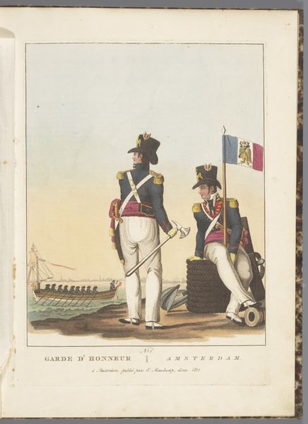 Editor: Here we have "Erewacht te Delft, 1811," a watercolor drawing now at the Rijksmuseum. It depicts two guards in uniform. The crisp lines and flat planes almost make it feel more like a fashion plate than a historical scene. What strikes you most about this work? Curator: I'm interested in the context of its production. Watercolors in 1811 – what did that signify in terms of artistic training, accessibility of materials, and potential market? Was this watercolor made for mass consumption as a print, or a unique item made for a patron? Editor: That's a great question. I hadn't thought about the economic aspect. Does the choice of watercolor suggest it was perhaps less valued than, say, an oil painting during that period? Curator: Precisely! Watercolors were often associated with amateur practice or preparatory sketches. Consider the social status attached to various artistic mediums. Who had access to what, and how did that influence artistic hierarchies? Perhaps the thinness of the watercolor wash alludes to frugality given the tumultuous Napoleonic era. Editor: So, by analyzing the material—watercolor—we're actually uncovering insights into the broader societal conditions and the economics of art production at that time. What can the subject—soldiers in uniform—reveal? Curator: The choice to portray guards raises further questions about the relationship between art, power, and the military-industrial complex of the Napoleonic era. Uniforms themselves are fascinating objects – mass produced items designed to establish identity. Their very creation implicates global resource extraction and the organization of labour to weave and tailor cloth. Do the colorful touches on these otherwise somber uniforms also provide commentary, however muted, on conspicuous consumption? Editor: It’s incredible how much information is embedded in seemingly simple images! Thinking about the material conditions, from pigment to textile production, really opens up new ways of understanding this piece. Thanks so much! Curator: Indeed! Paying attention to these details pulls art from the realm of mere aesthetic appreciation into the very real world of labour, materiality, and power relations.