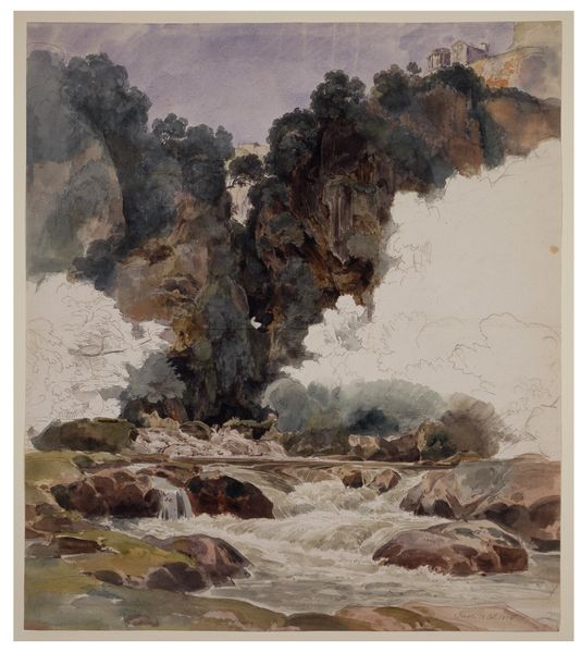 Curator: Here we have Fritz Hauck's "Bird crater on Java," a watercolor and drawing believed to have been completed around 1900. What's your first impression? Editor: It’s almost desolate—the steamy haze obscuring the landscape feels oppressive, heavy with something unsaid. I notice a striking contrast between the hazy foreground and the dense, verdant background. Curator: It’s interesting that you mention the “unsaid”. When looking at it materially, you realize he traveled to Java, sourcing the specific pigments to convey this location. Java's volcanic landscape offered rich source material; it was likely chosen for its specific mineral composition. We could consider what the artist gained socially by aligning himself with exotic locales. Editor: Right, we should also question the "exotic" label itself. To a European audience at the time, Java may have been framed as a wild, untamed place, reinforcing colonial power structures. The image becomes less about objective landscape and more about constructing a particular vision of a colonized land. How complicit was Hauck's practice within this frame? Curator: Hauck clearly shows technical facility with the watercolor medium, mastering light and atmosphere, but what does that proficiency enable? What narratives are constructed by romanticizing labor? Editor: Indeed. While appreciating Hauck’s artistry, we must be sensitive to the context in which this art was made, considering whose stories are privileged and whose are erased, challenging the orientalist trope present in the work. Curator: I find your interpretation insightful, considering not only the technique of the artwork but also its connection to social and economic contexts of its making. Editor: Likewise, focusing on labor practices gives critical perspective and historical context to these pieces. I encourage listeners to question what appear obvious and what other perspectives exist beyond the artistic rendering.