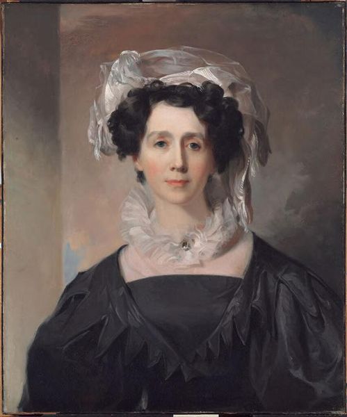 Editor: This is Christiaan Julius Lodewijk Portman’s “Portrait of Maria Christina Nijssen, Wife of Anthonie van der Hout,” painted in 1826 using oil. I’m struck by how the artist captures a sense of restrained elegance. What compositional elements stand out to you? Curator: The subdued palette immediately demands attention. Note the dark background against which the subject emerges, a common technique to emphasize form. Consider the geometry—the severe verticality contrasts with the soft curves of her ruffled collar and delicate ringlets. Do you see how the eye is directed? Editor: I notice that her gaze is directed off to the side. How does that choice affect how we see her? Curator: Precisely! The averted gaze disrupts direct engagement, fostering intrigue rather than confrontation. Further, her formal pose emphasizes a rigid structure that hints at societal constraint, but her gently clasped hands inject some naturalness into this composure. The textures, such as the smooth dress and the delicate lace, each signal different levels of artistic dexterity and meaning, don’t you think? Editor: Definitely. The contrasting textures really do add a sense of depth and realism to the portrait. It's more than just a likeness; it's a presentation of status and personality intertwined. Curator: Agreed. What the painting reveals in its very construction offers a glimpse into more than meets the eye. Editor: It’s amazing how much you can understand just by looking at these formal aspects. Thanks for sharing your insights!