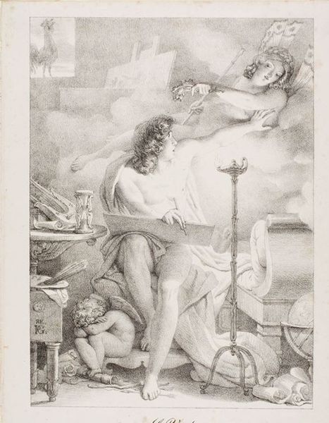 Editor: Here we have "Plate Four from Misery," a lithograph created by Charles Rambert in 1851. It's currently held at the Art Institute of Chicago. There’s a strong feeling of darkness and despair that emanates from the print… almost nightmarish. What do you see when you look at this work? Curator: Nightmarish is a wonderful descriptor, it reminds me of a fractured fairytale, perhaps something the Brothers Grimm left on the cutting room floor! I'm drawn to the contrast between the ethereal scene above and the earthly suffering below. Notice the gaunt figure whispering, perhaps planting seeds of envy. It’s as if Rambert is showing us a battle for the soul. What do you make of the sleeping family in the lower left corner? Editor: They look peaceful, oblivious almost, to the drama unfolding above. They're wrapped in this soft, dreamlike state, contrasting sharply with the tense figure being tempted. Curator: Precisely! The sleeping family embodies innocence, while the standing man embodies a crossroads, a moral dilemma if you will. Consider the historical context. 1851 France, a time of immense social upheaval. Rambert, through Romanticism, offers a raw commentary on poverty and its corrosive effects, where envy and desperation gnaw away at the soul. Editor: So it's like, misery preys on those who already have nothing to lose? Curator: Exactly! Misery, personified, whispers the promise of escape through questionable means. But is it truly escape, or just a deeper circle of hell? I love how the bright, almost heavenly scene with figures who 'arusent de tout' seems like a cruel taunt. The inscription states how “misery shows man, who has hunger, those who profit from everything”. This highlights the dark irony that the promise of such gain creates hatred and envy. The composition, too, pushes the viewers gaze, it urges one to delve into it, feel it… which, admittedly, is profoundly unsettling. Editor: That’s powerful, I see it now! It’s more than just a depiction of poverty; it's an exploration of its psychological toll. Curator: And isn't it fascinating how a print from almost two centuries ago can still resonate with us today, provoking thoughts about social justice, inequality, and the human condition? A successful piece does just that!