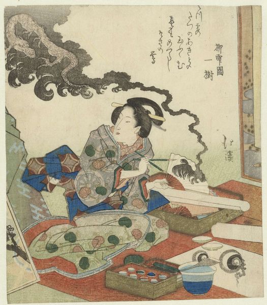 Curator: This captivating print, “Woman making a Sand Painting," was crafted around 1820 by Utagawa Kunisada, also known as Gototei Kunisada, one of the most successful designers of ukiyo-e woodblock prints of his age. It's currently held at the Rijksmuseum. What's your immediate response? Editor: I find the quiet, almost meditative, nature of this work so striking. There's a stillness in her posture and the scene as a whole, a sense of absorbed focus. What do you make of this mood in terms of Kunisada's overall work and the broader context of Ukiyo-e? Curator: Kunisada’s work is frequently about depicting everyday life and the fashionable figures of the Edo period. Here we see this perfectly. We also get an insight into how Kunisada negotiates traditional gender roles. The figure of a woman is a key feature in Kunisada's pieces; how he situates them can give interesting commentaries on the society he found himself in. Editor: Absolutely. Considering feminist theory and power dynamics at play within this image, it prompts several thoughts. Is she creating or destroying? Ephemeral art, like a sand painting, has an inherently transient nature, suggesting themes of impermanence and loss. How does the act of creation intersect with ideas around womanhood in Edo period Japan? Curator: These are fascinating questions. Japanese aesthetics have always heavily featured the appreciation for things in light of their transience. Thinking about Kunisada as an artist, he grew up in a society transitioning from feudalism to modernity, how would his societal consciousness reflect these traditional cultural values against changing cultural values? The prints like this became affordable due to new advancements which also influenced and expanded the reach of social and political commentaries to reach different classes. Editor: Right, that point on accessibility shifts the context. The availability of these images contributes to the democratization of art, but it simultaneously raises questions of commercialization and cultural appropriation, which complicates the reception of the work itself. Curator: Definitely, this allows a re-imagining of social interactions, how certain cultural norms might have evolved to reach contemporary forms, while we remain cognisant of all the oppressive structures that persisted in that past society and potentially find continuity across temporal existences. I am fascinated with what conversations like these enable us to have. Editor: I agree completely, placing these images in our historical narrative facilitates complex reflections on the historical evolution of the cultural landscape in the Ukiyo-e movement and more widely.