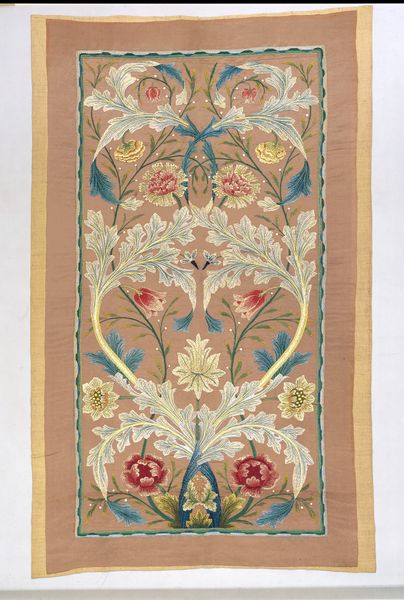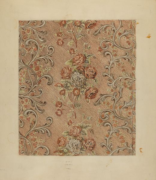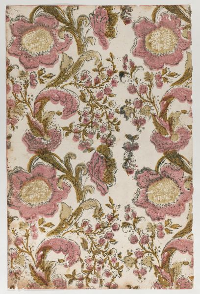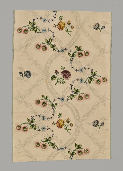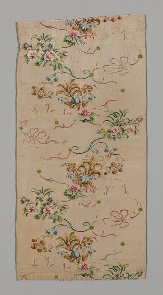 Editor: This is an anonymous "Panel" made around 1730. It’s a silk textile currently housed at the Minneapolis Institute of Art. The colors are so delicate; it makes me think of a very fancy wallpaper sample, but much older! How would you interpret this textile? Curator: Looking purely at its formal qualities, the piece strikes me as a prime example of the transition from Baroque to Rococo. Observe the symmetrical, repeating pattern, typical of Baroque design, yet softened by the asymmetry of the floral arrangements within each mirrored motif. Editor: I see what you mean. It's orderly, but also… kind of wild? Curator: Exactly. Note the interplay of textures. The flat silk ground acts as a foil to the intricately woven floral patterns, creating a subtle tension. Consider also the color palette. Editor: Yes, they're pastel. They seem faded. Curator: The choice of colors may evoke fading; yet the silk maintains the luminosity of the colors of Rococo interiors. Could this seemingly delicate pattern, repeated endlessly, actually hint at the dynamism that propelled society into its next stages of refinement? Editor: So, you see the structure fighting with this… burst of ornamentation? That’s a really interesting point about societal shift. Curator: Indeed. It’s in these visual dialogues, these tensions, where the true meaning of the piece resides. We can observe a movement toward complexity even with such rigid forms. Editor: That tension between order and ornamentation is something I definitely missed before, but it makes so much sense seeing the bigger picture. Thank you for sharing such thoughtful insight! Curator: The pleasure was all mine. Sometimes the beauty lies not just in what is seen, but in understanding how it's been constructed and what forces are in play.